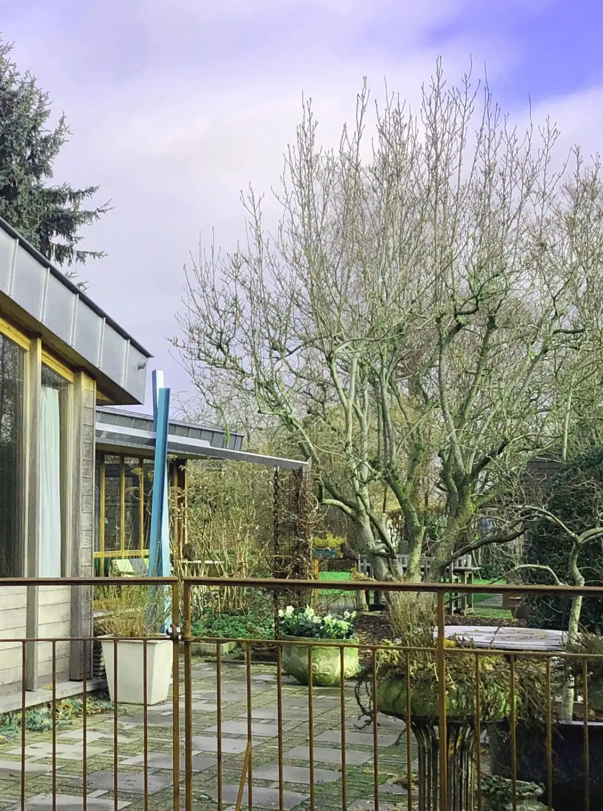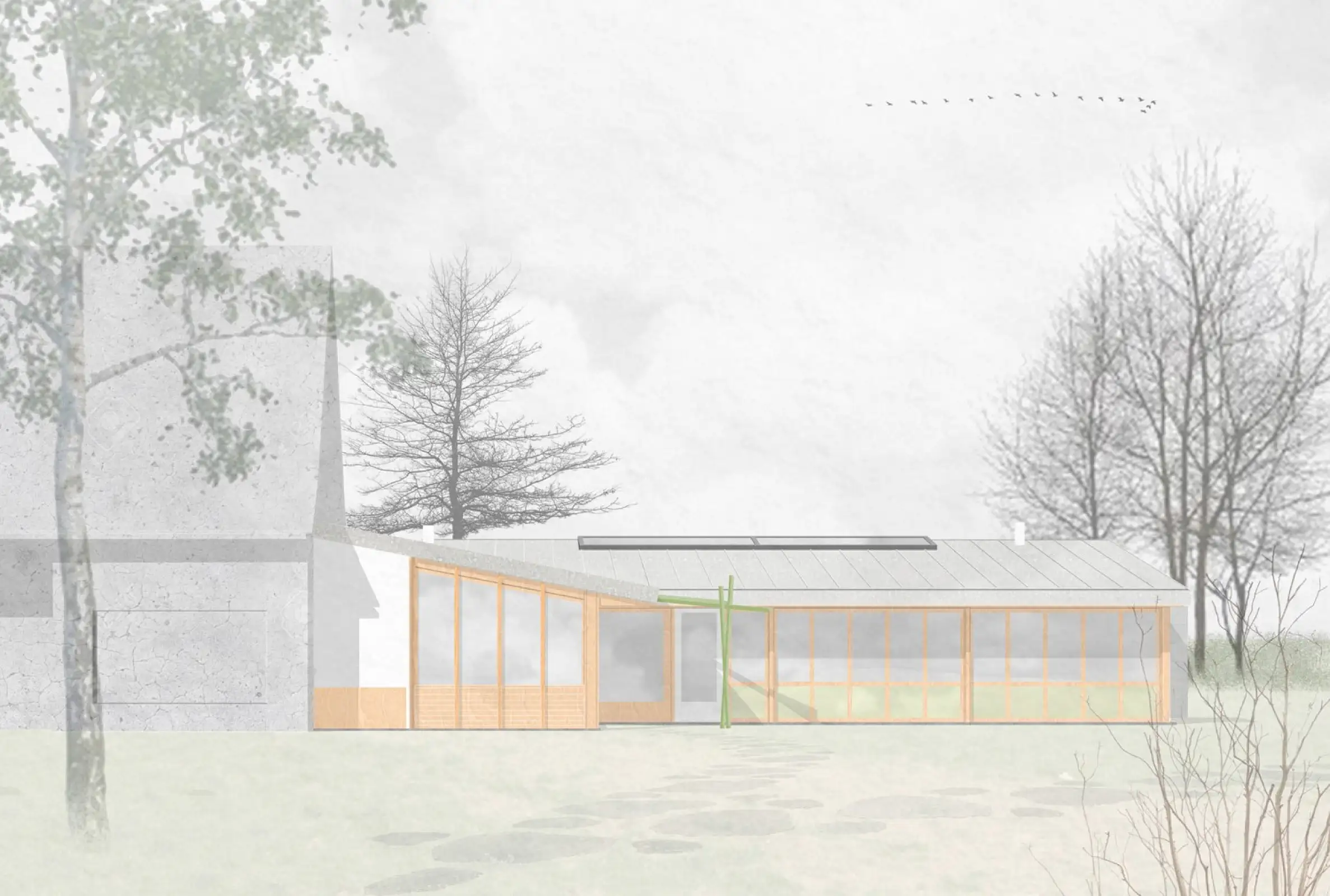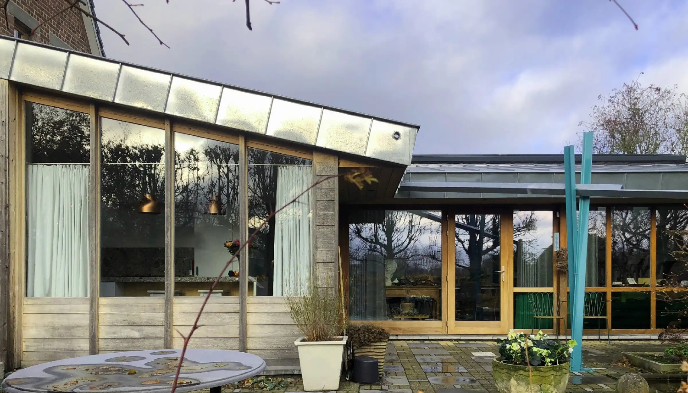 This L-shaped studio serves as both an exhibition space and a residence for international artists. It also functions as a summer pavilion and a multipurpose area extending the main house. The studio has a separate entrance and dedicated sanitary facilities. The second wing contains the kitchen of the residence. The two wings can be separated from each other. The studio acts as the connecting element between the enclosed house and the long garden at the rear.