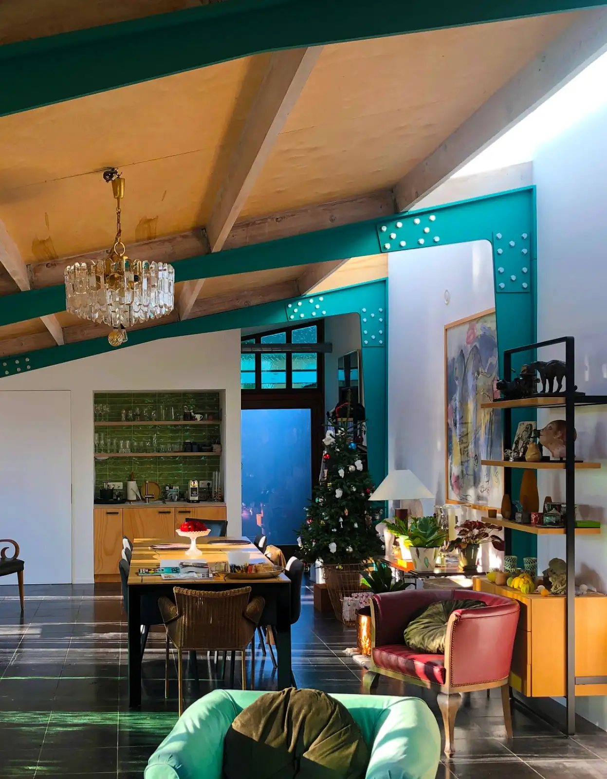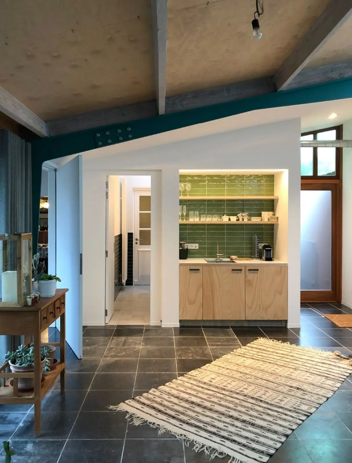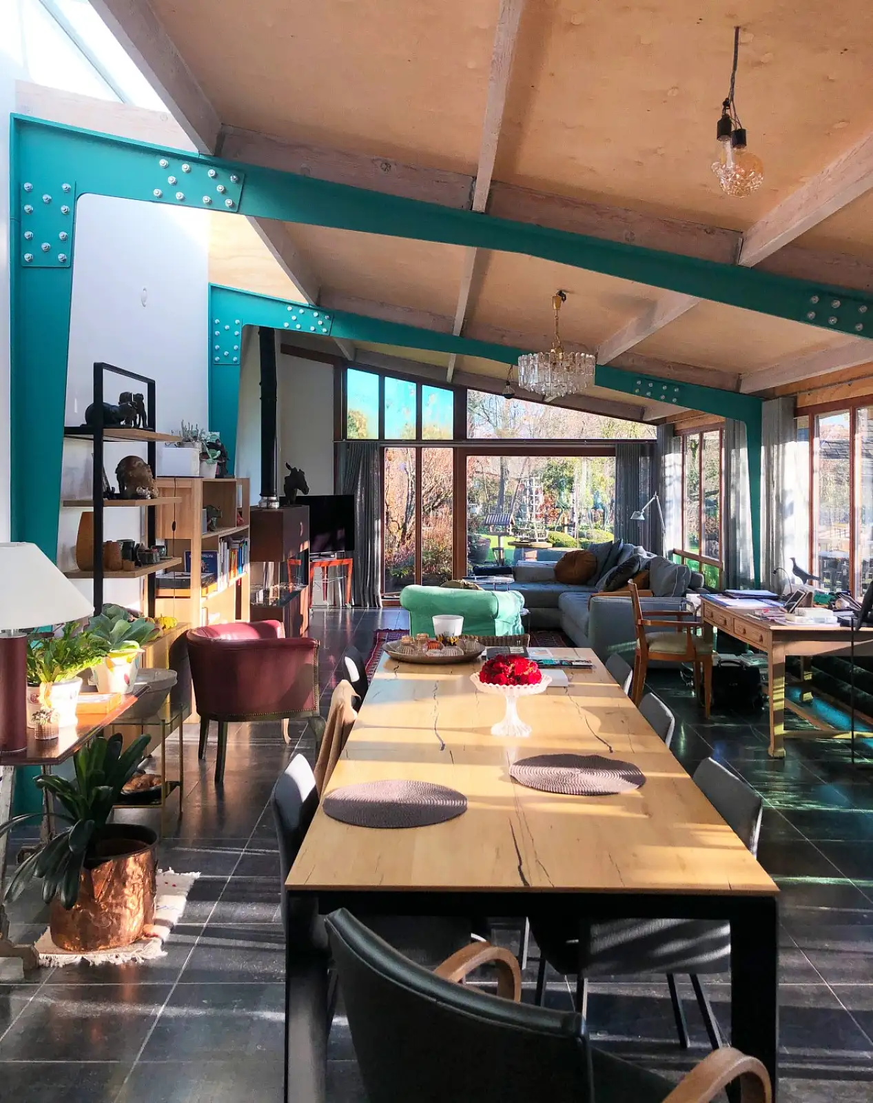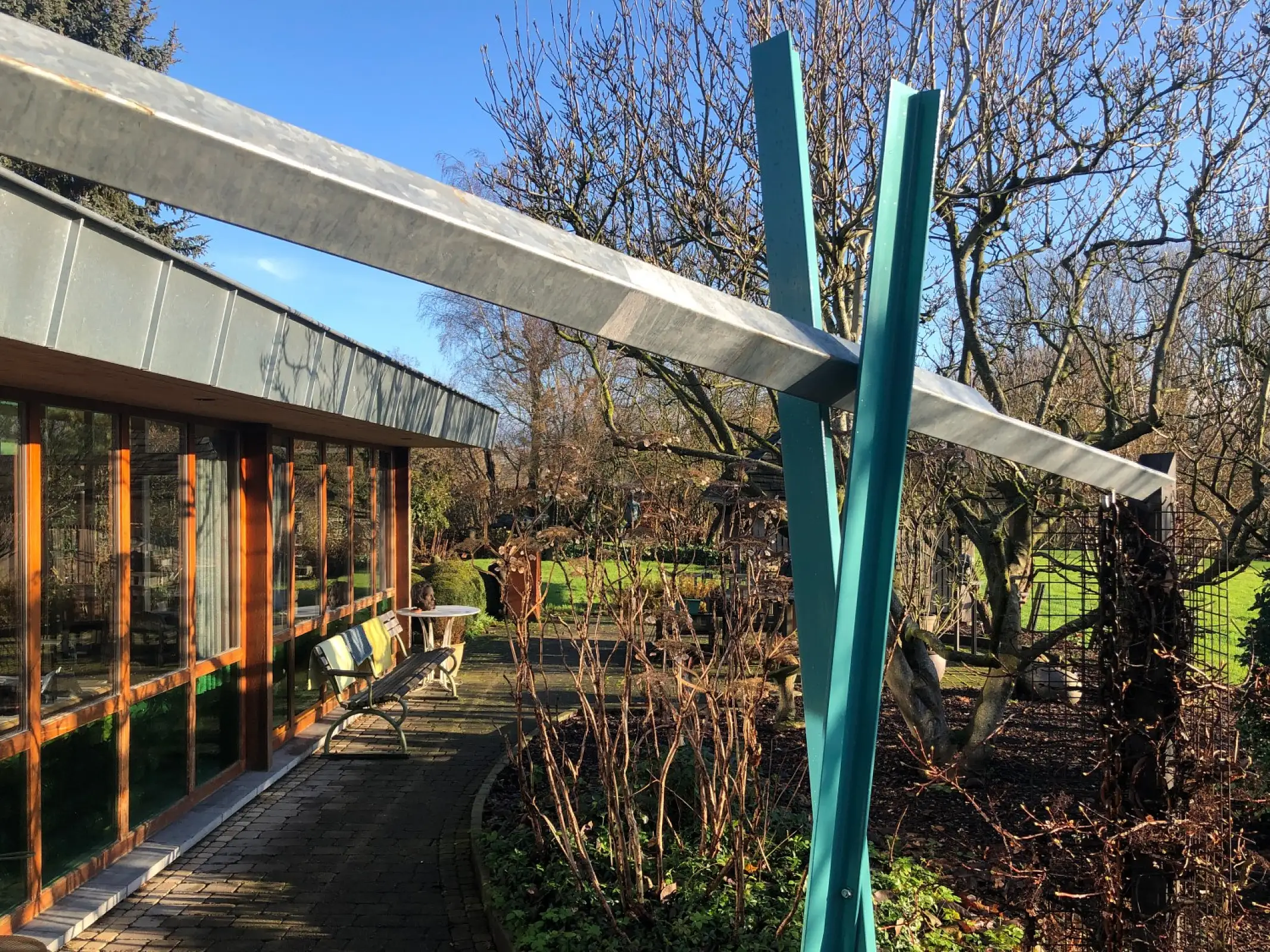 This L-shaped studio serves as both an exhibition space and a residence for international artists. It also functions as a summer pavilion and a multipurpose area extending the main house. The studio has a separate entrance and dedicated sanitary facilities. The second wing contains the kitchen of the residence. The two wings can be separated from each other. The studio acts as the connecting element between the enclosed house and the long garden at the rear.