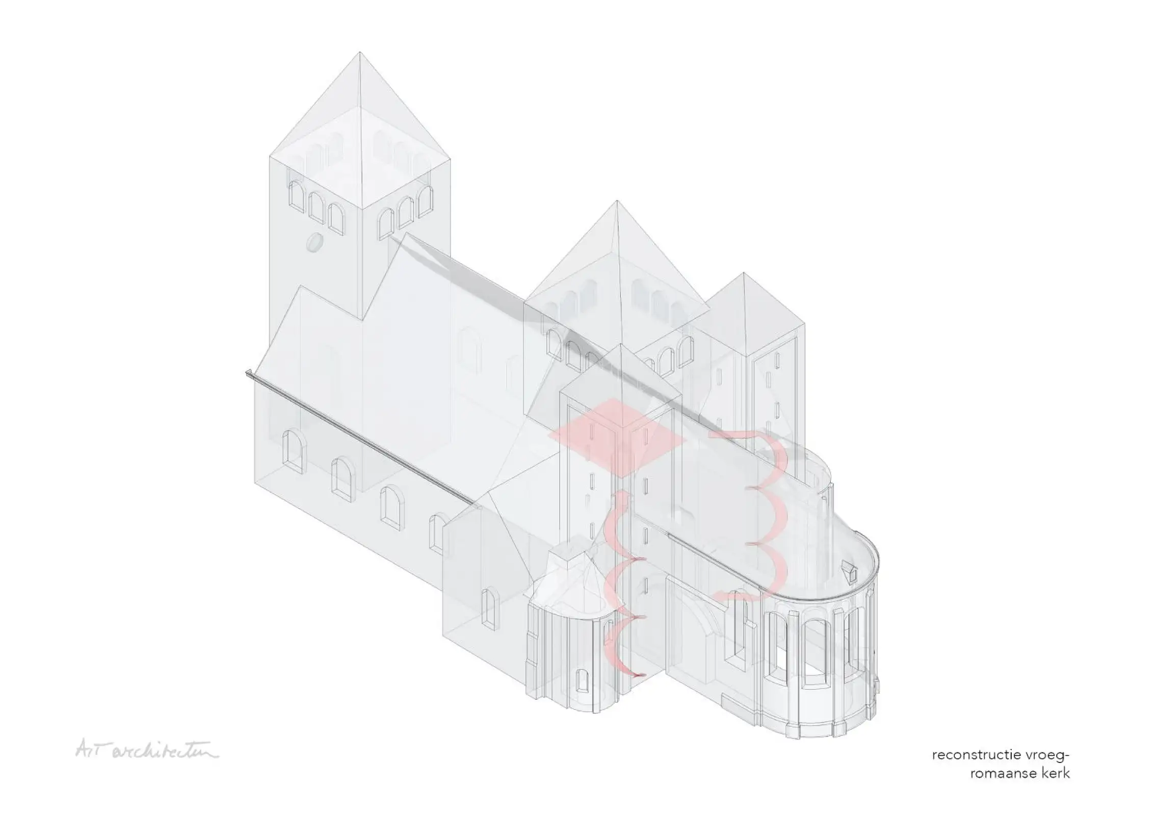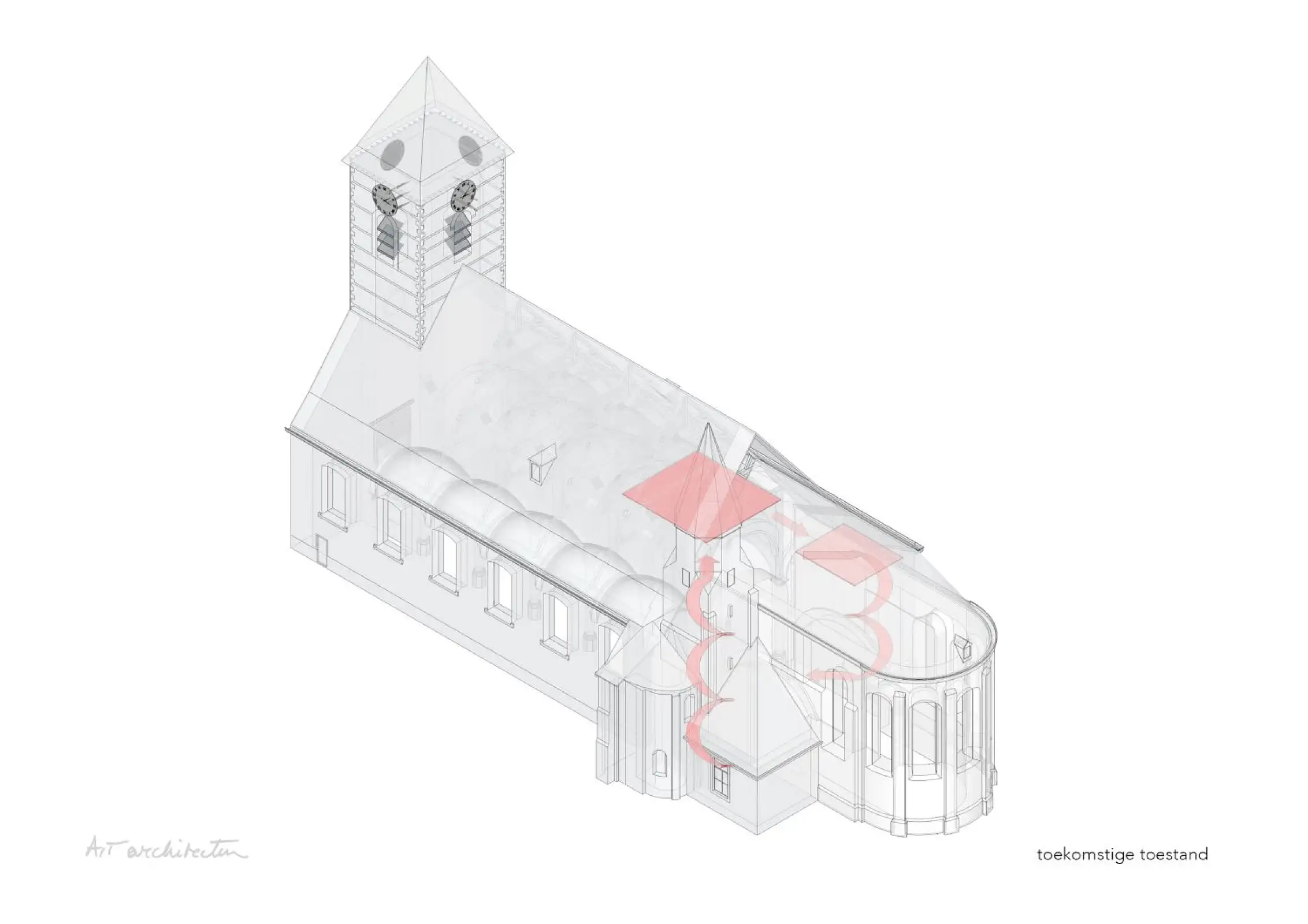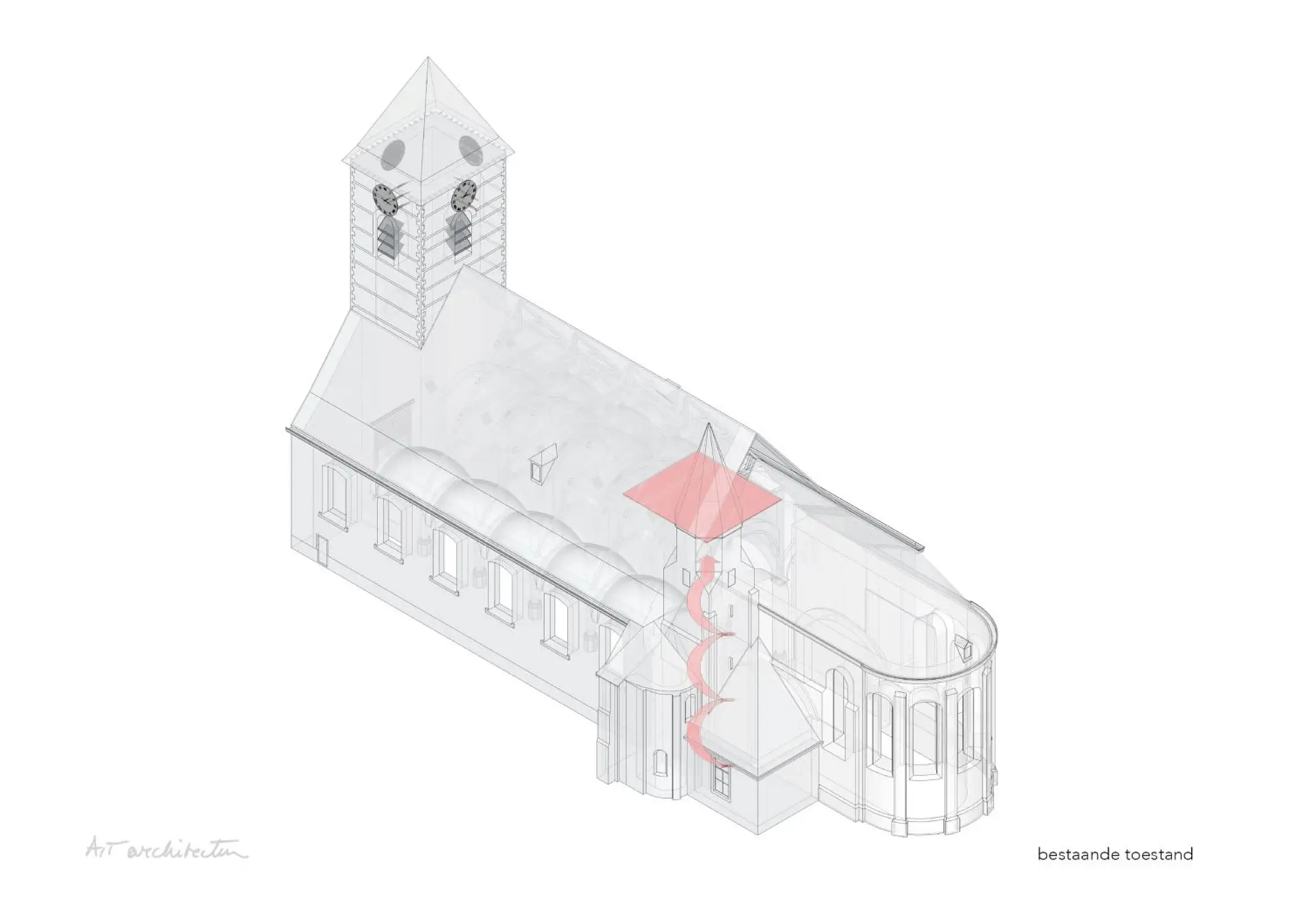 There is also a ‘forgotten’ northern stair tower, currently used for storage, which contains equally valuable Gothic wall paintings. By modifying the roof plane and making the choir roof accessible, a museum-like circulation is created, making the restoration and consolidation of the northern tower’s murals meaningful.