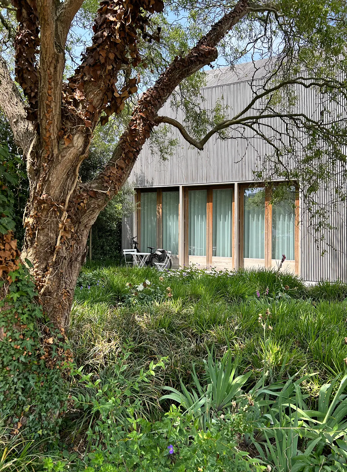 A long-abandoned farmstead stands halfway across the site. The front garden is bathed in sunlight, defined by the atmosphere created by a large conifer and a charmingly irregular willow. The old building acts as a screen between the street and the owner’s residence, which sits within a landscaped garden in the surrounding countryside.
