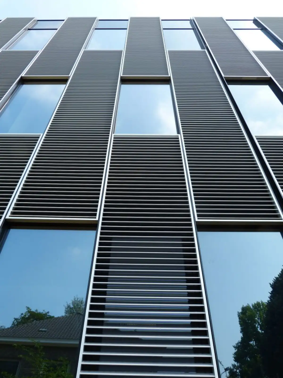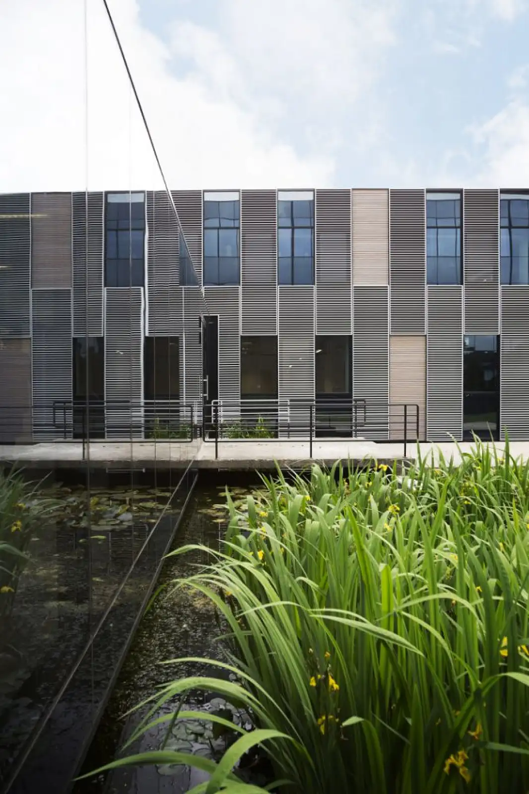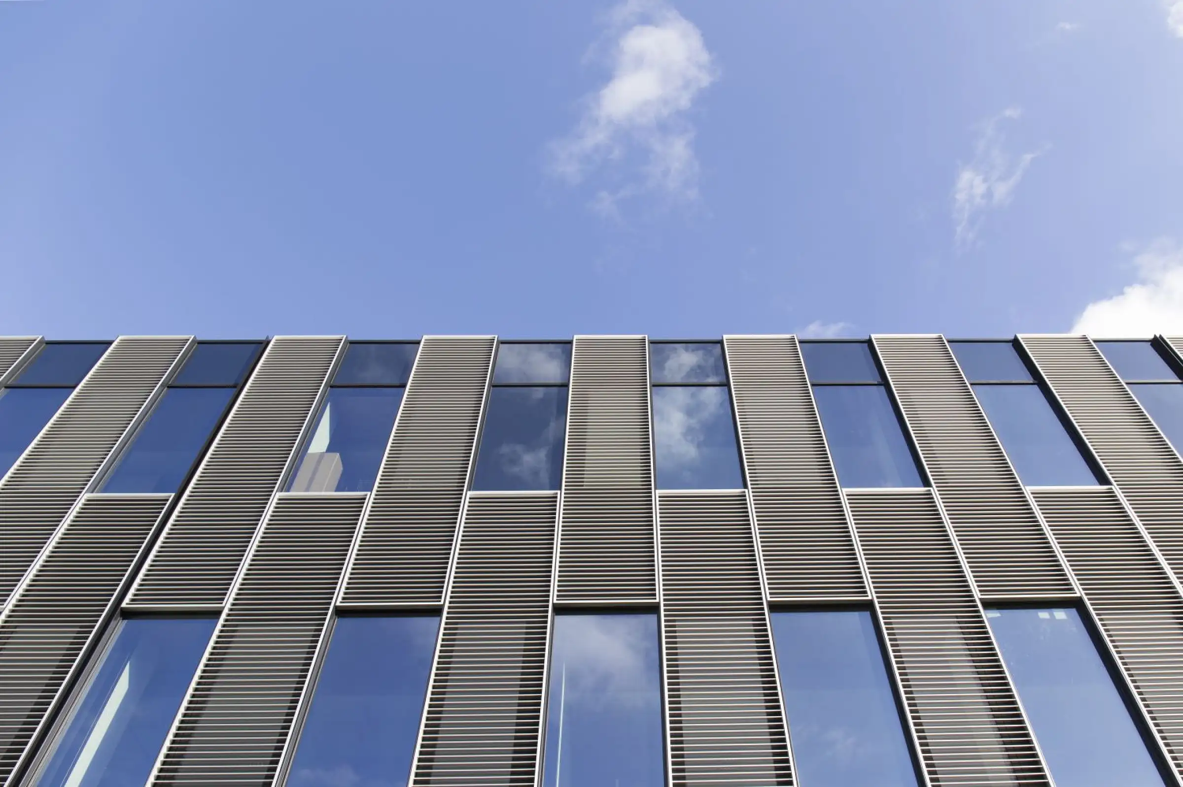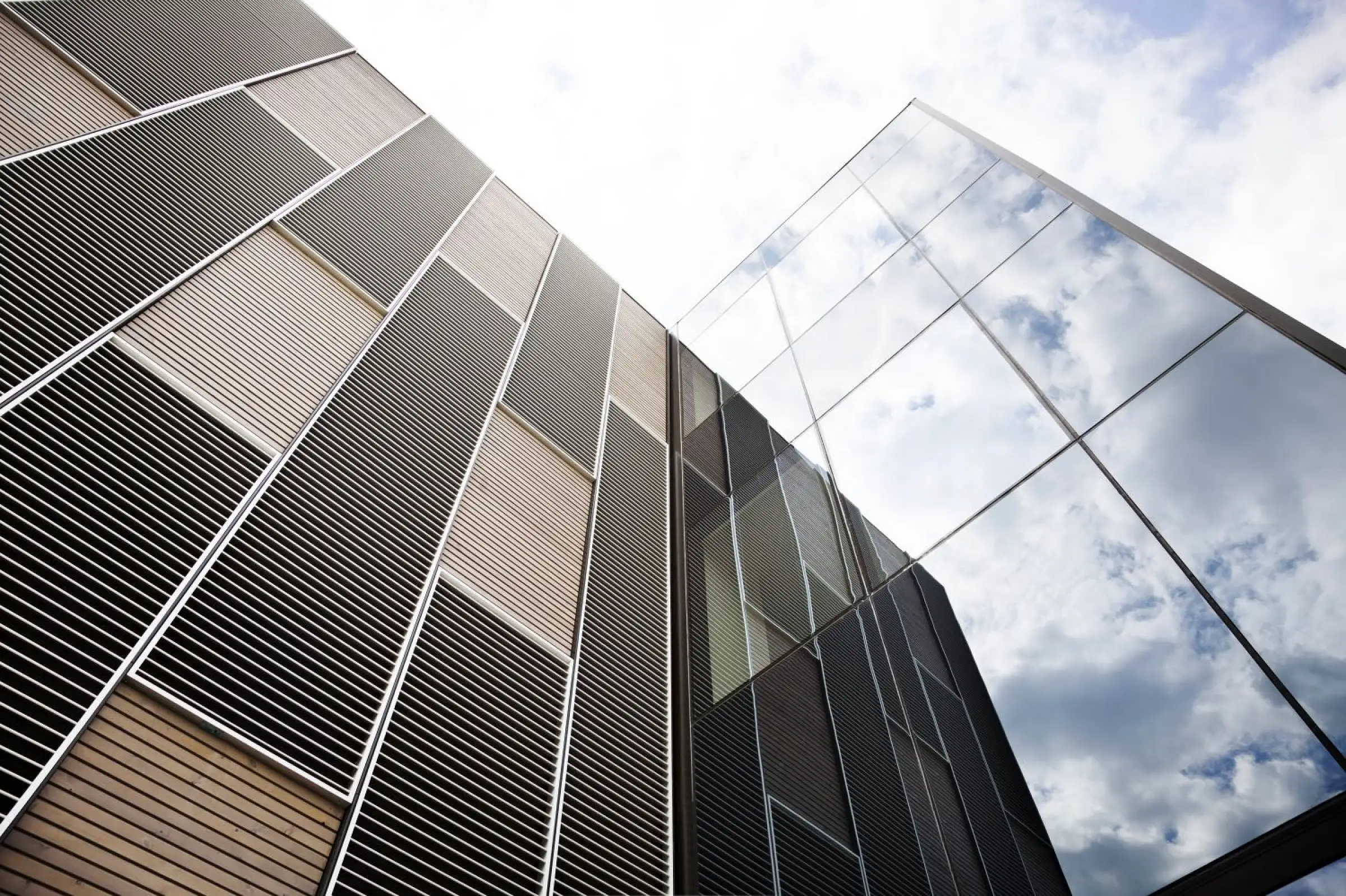 In 2014, the existing buildings were energetically renovated and expanded. Concrete degradation was thoroughly examined and repaired through carbonation testing. The structure was further reinforced, and the buildings were wrapped in light curtain walls with open, closed, and semi-transparent sections arranged in a woven pattern.
