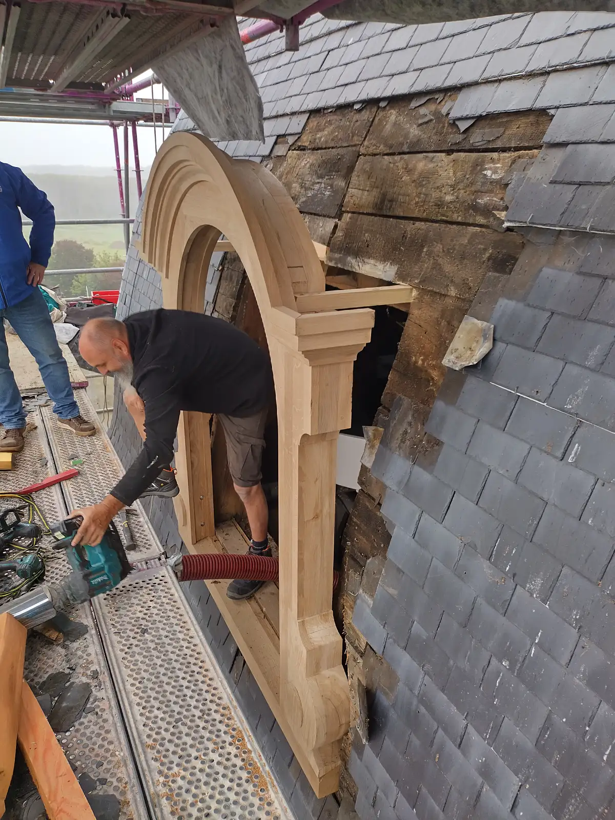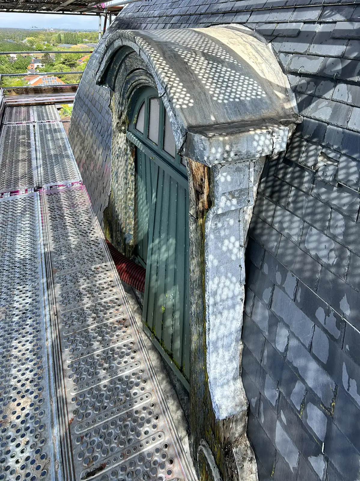 The first phase focuses on the tower, the most vulnerable and least accessible part of the building. The tower had fallen into a state of disrepair: vegetation was growing on the cornices, the roof showed several issues, the tower clock was worn out, the dormers were deteriorated and early damage had appeared in the brickwork and natural stone. With the available resources, it was therefore decided to tackle the tower as a priority.