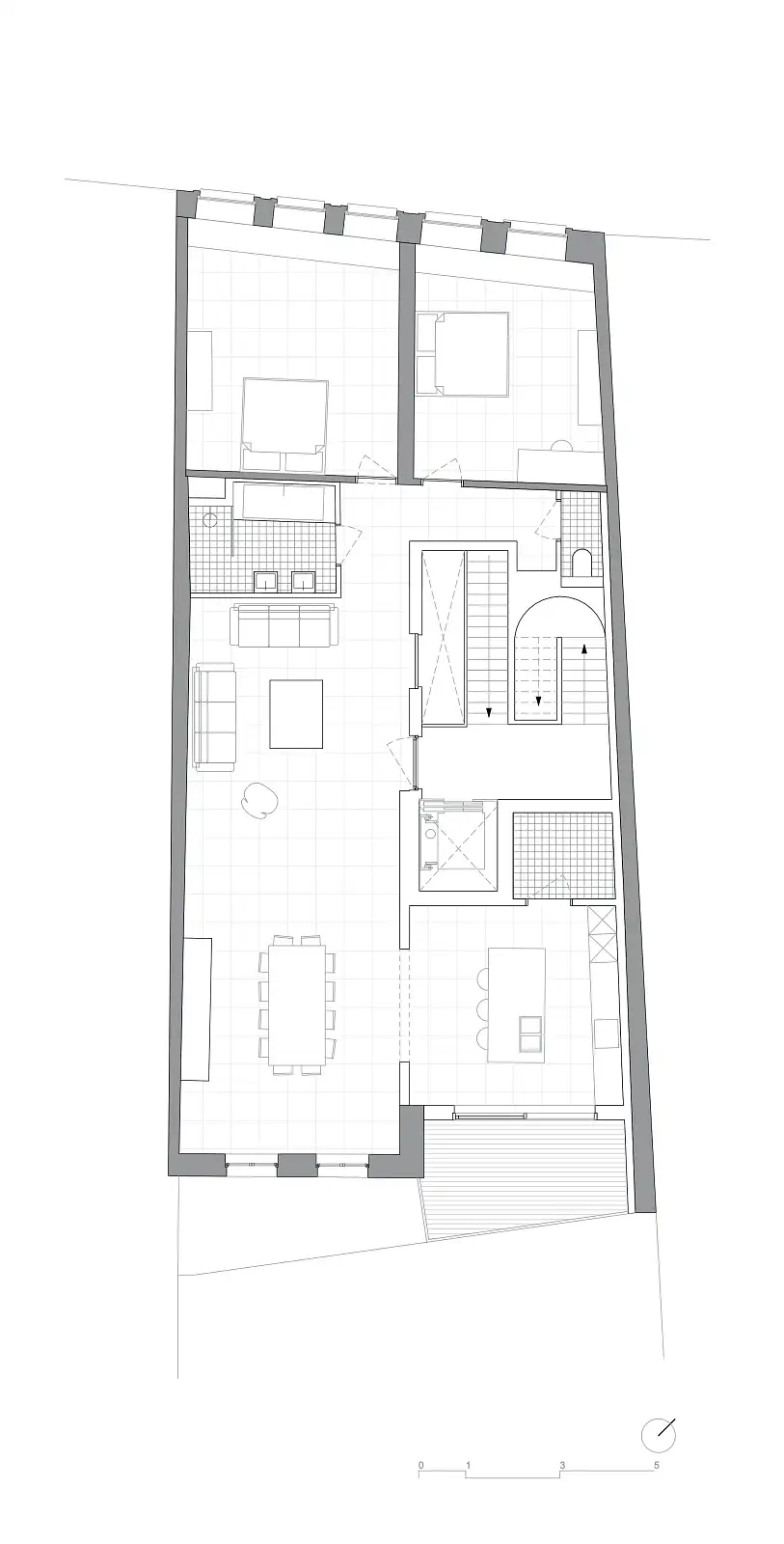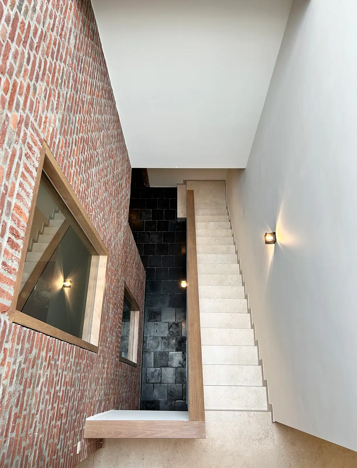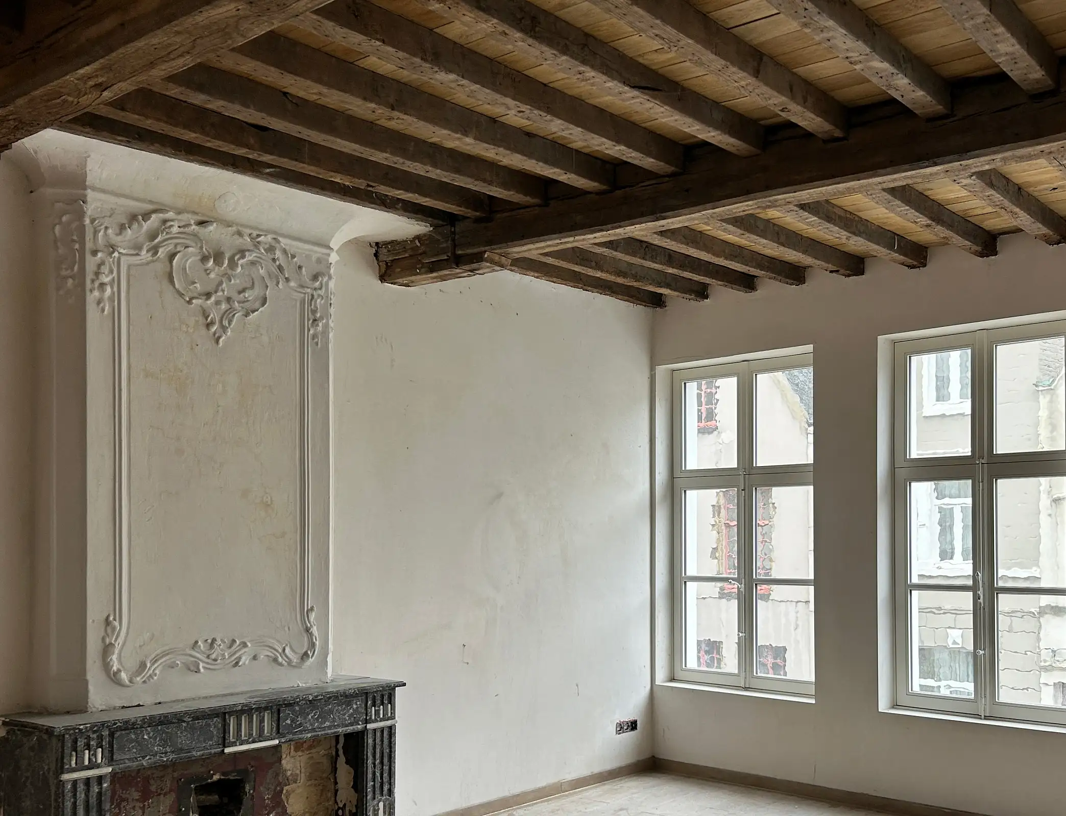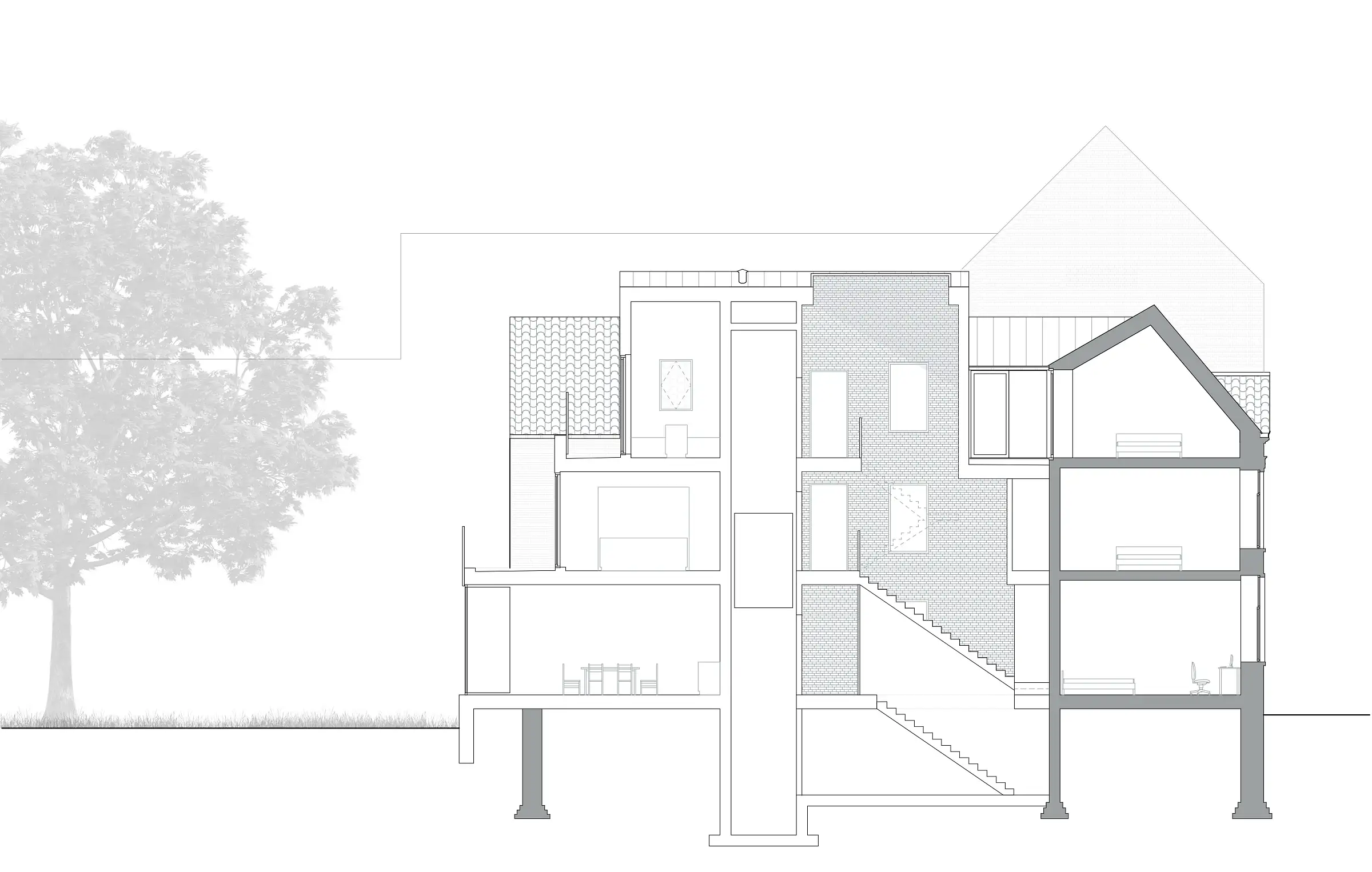 A 16th-century front and rear house were merged at the end of the 18th century in a classic Rococo style. In the 20th century, the building was converted into the Snijschool (cutting and sewing school), during which it was completely silted up. The dilapidated building has been thoroughly renovated into two offices and two residential units. The original layout of the front and rear houses has been respected. The historic oak grilles and plastered mantelpieces have been preserved and restored. At the centre of the building, a new vertical light well around which the stairs circulate brings natural light to the ground floor. The 20th-century incision with the large “SNIJSCHOOL” window has been retained, but the vertical windows have not been reconstructed. In the rear façade, the old rear house is still present on one side, with a new wooden infill with large windows and terraces next to it, giving a contemporary touch to the living and office spaces.