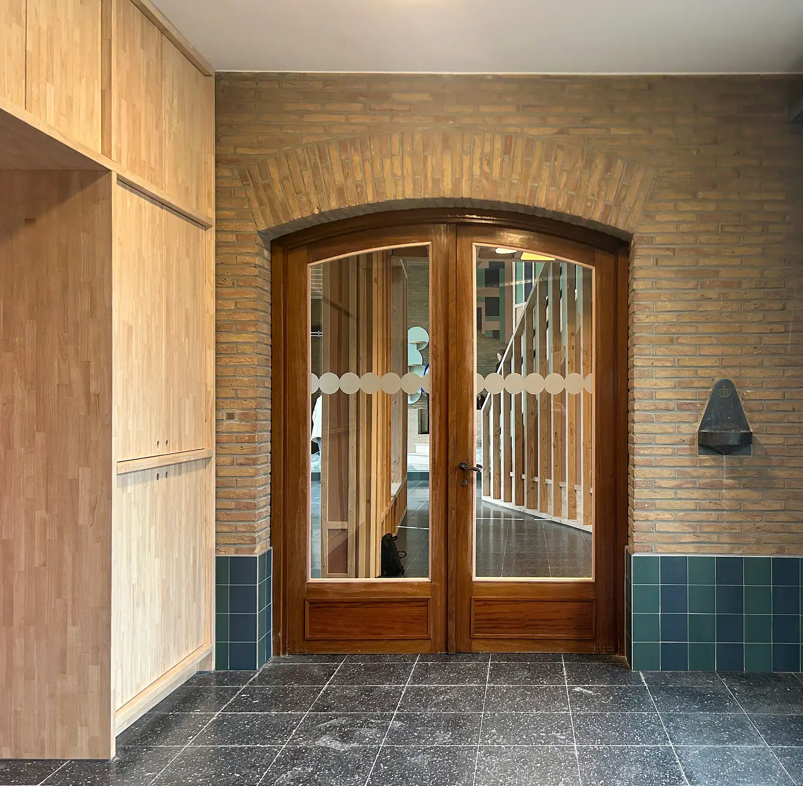 The rear side of the building has become the new entrance and the heart of the complex, featuring an open and transparent structure in contrast to the closed exterior façade. The new entrance aligns with a new axis leading to the childcare center, located in the former chapel and connected to a green outdoor environment.