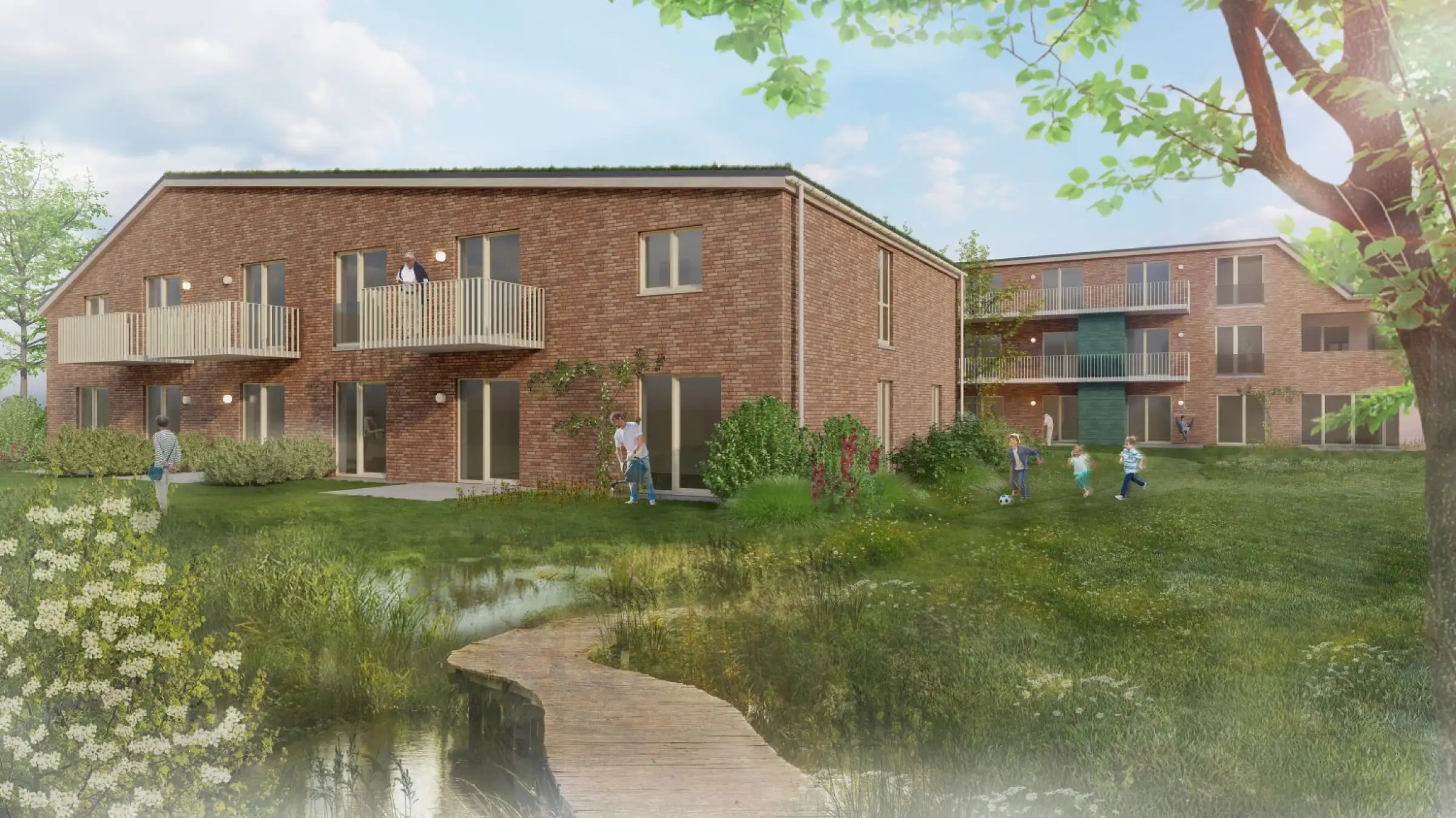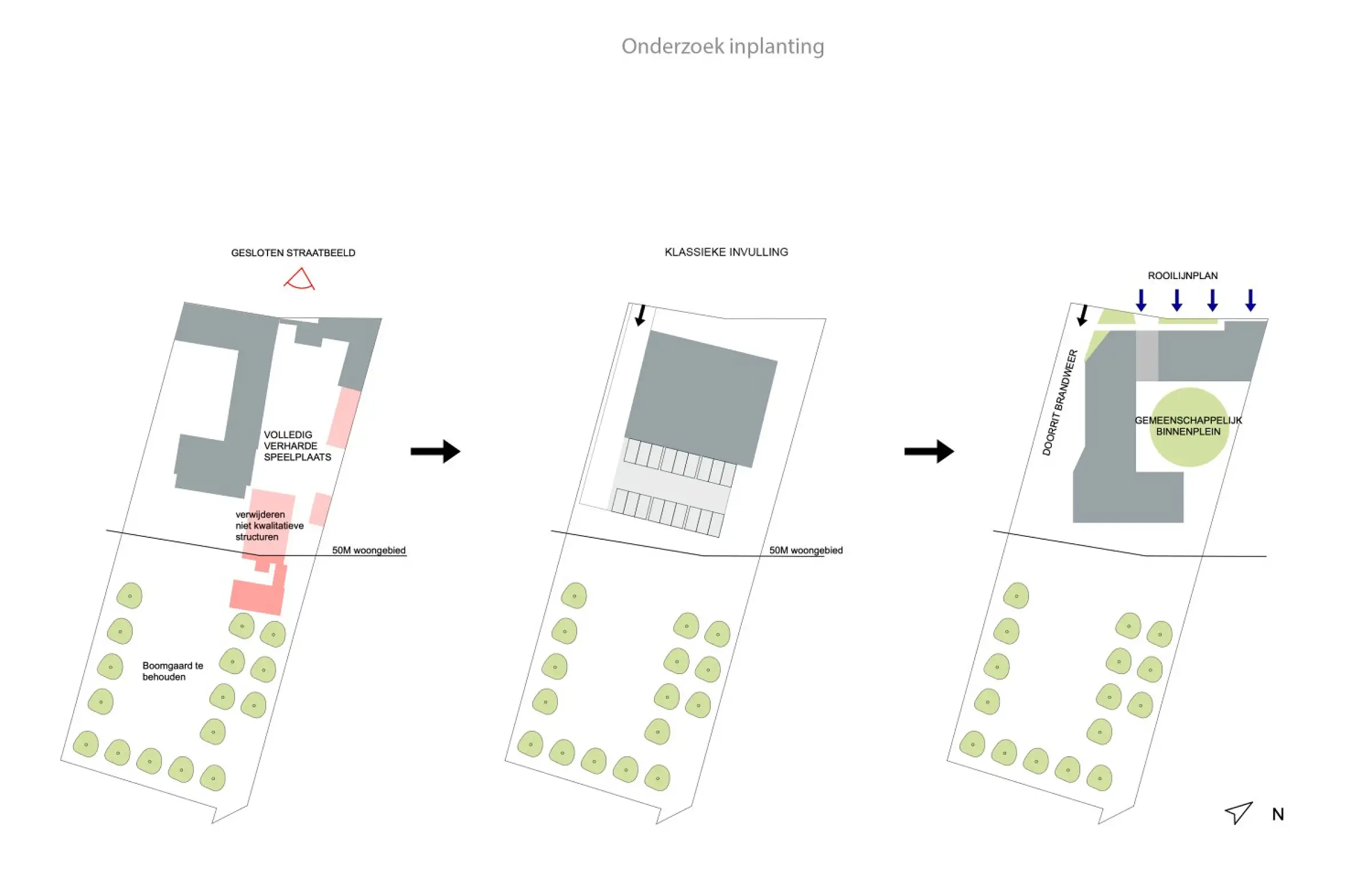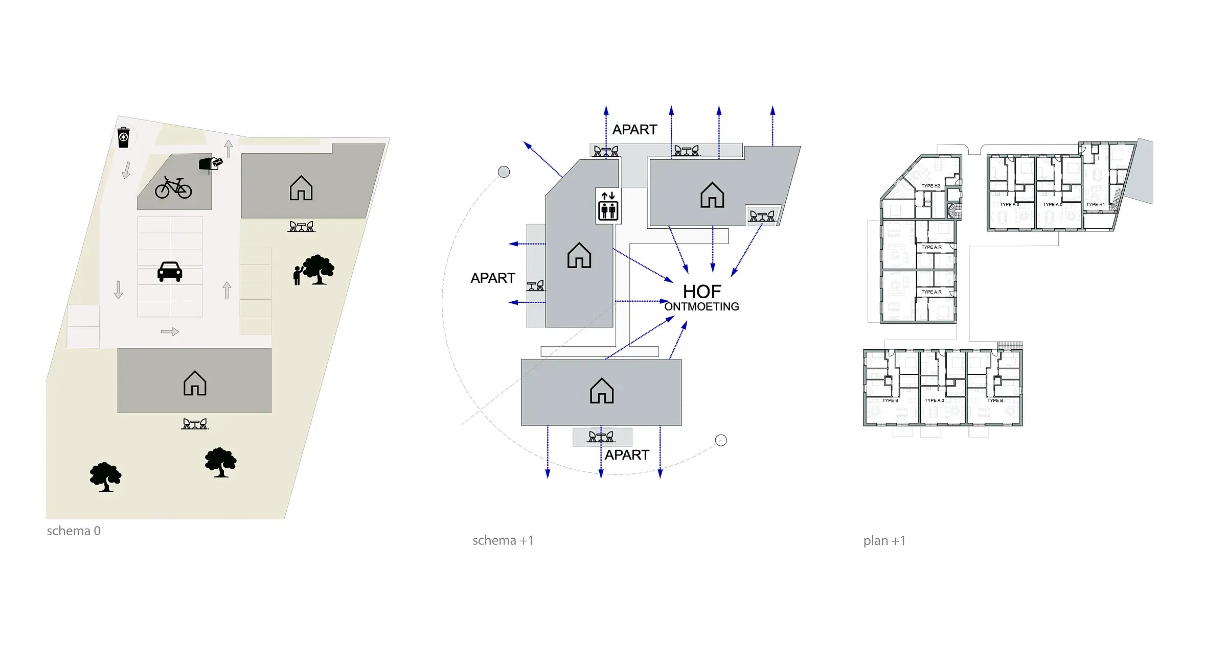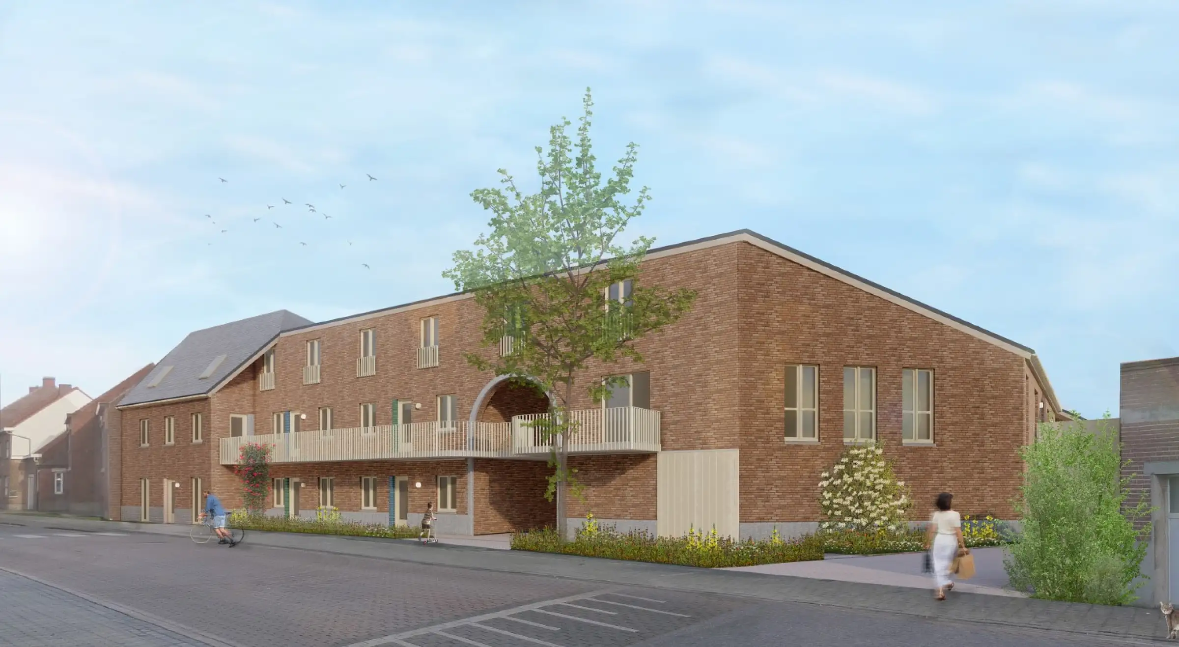Through the central courtyard, all residents have access to the communal orchard located behind. Each dwelling features a terrace and offers interesting views and natural light thanks to its orientation. The design fits perfectly within its surroundings: on one side it connects to a blind wall, while on the other side there is an open strip leading to the presbytery, which is set back from the street. The central round entrance gate refers to the former school gate and serves as a large, welcoming gesture from the street toward the courtyard and vertical circulation.