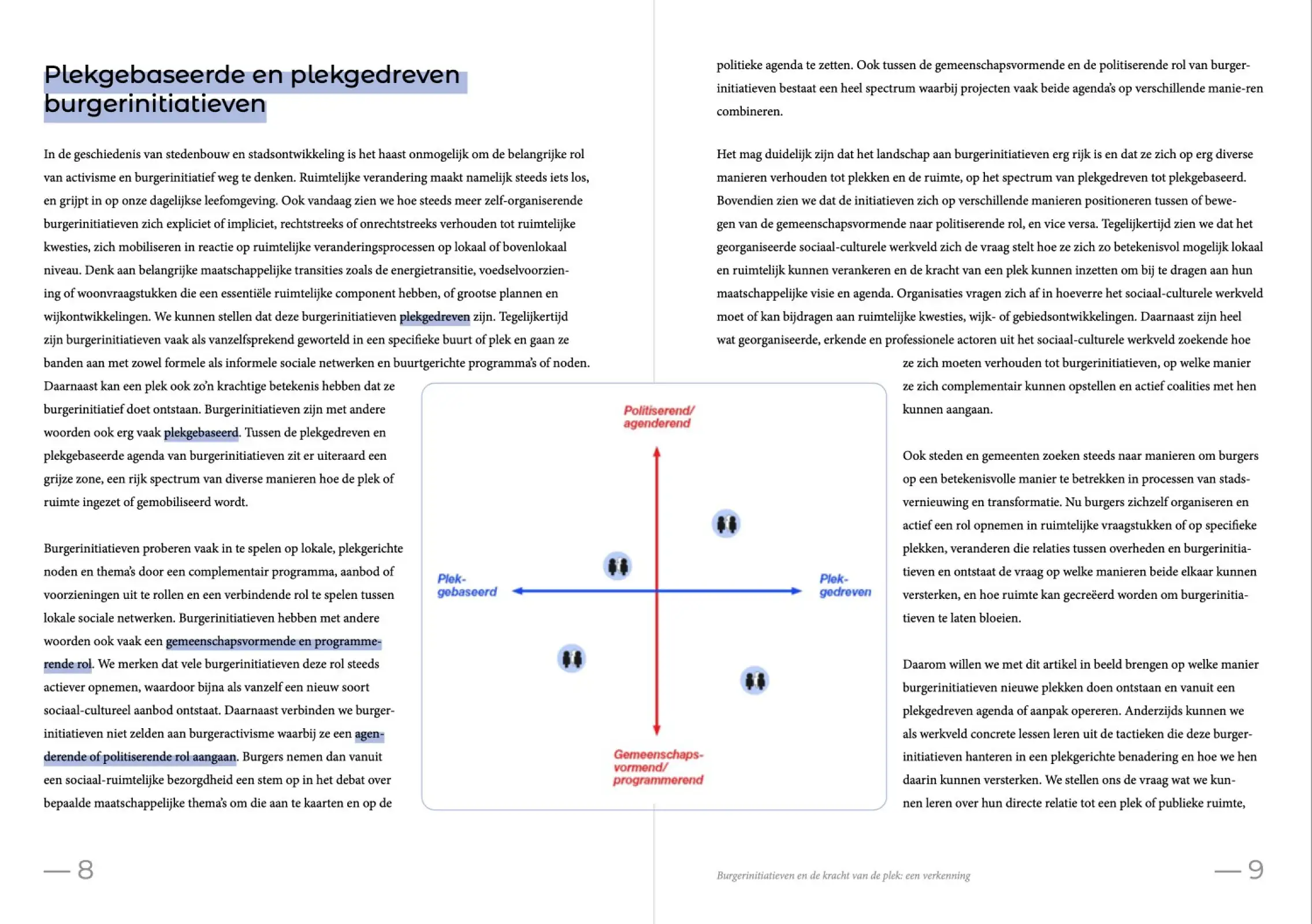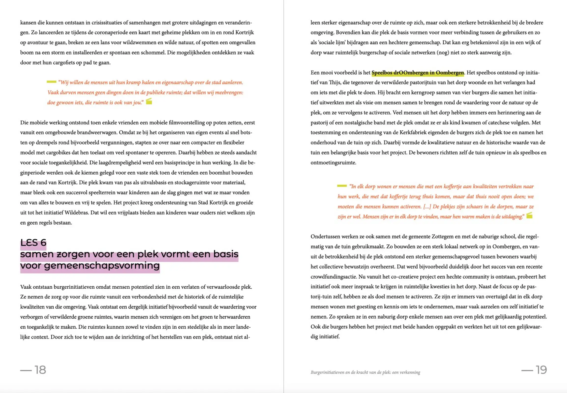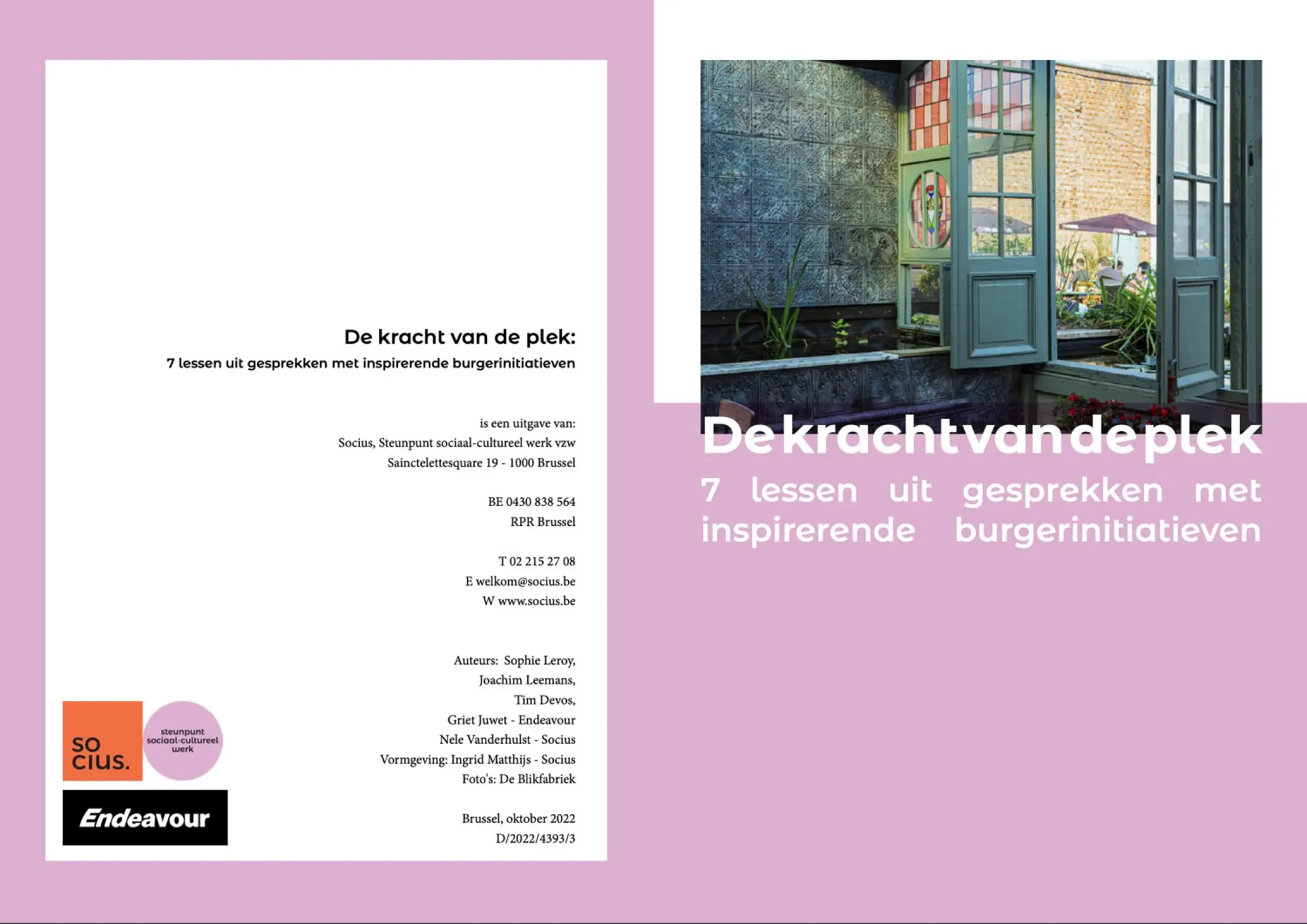 Met dit artikel brengt Endeavour in beeld op welke manieren burgerinitiatieven nieuwe sociaal-culturele plekken doen ontstaan, of welke tactieken burgers hanteren om plekken te mobiliseren of op ruimtelijke uitdagingen in te spelen. Ze gingen daarvoor in gesprek met heel diverse projecten: Dwarsligger in Melle, Samen Voor Morgen in Sint-Jans-Molenbeek, Tuinwijk 2020 in Maasmechelen, Lieve Zusjes Stoere Broers in Kortrijk, O.666 in Oostende, speelbos drOOmbergen in Oombergen, en Free 54 in Brussel. Op basis van die verhalen formuleren ze 7 lessen over de rijke, complementaire en overlappende relaties tussen burgerinitiatieven en plekken.