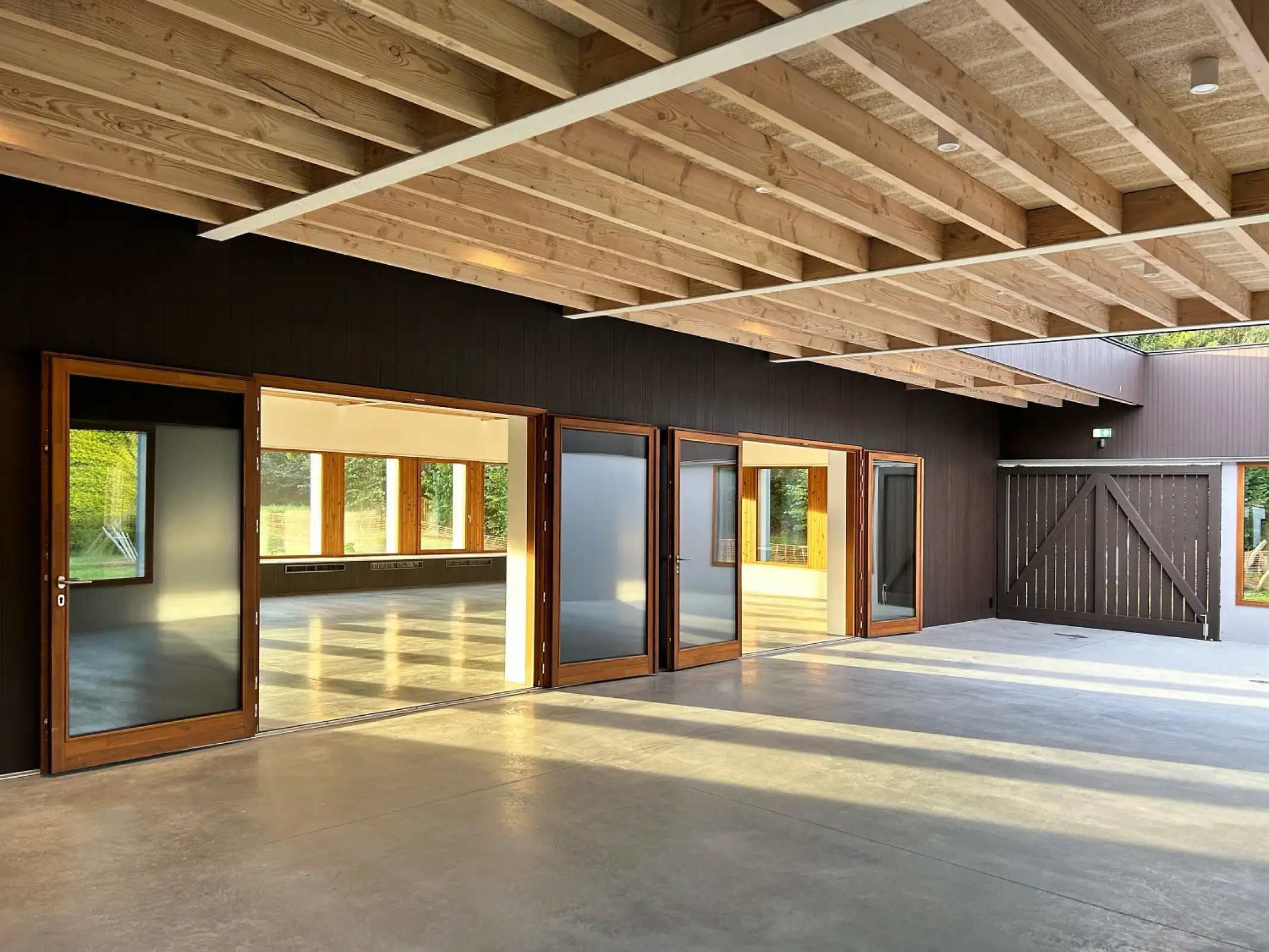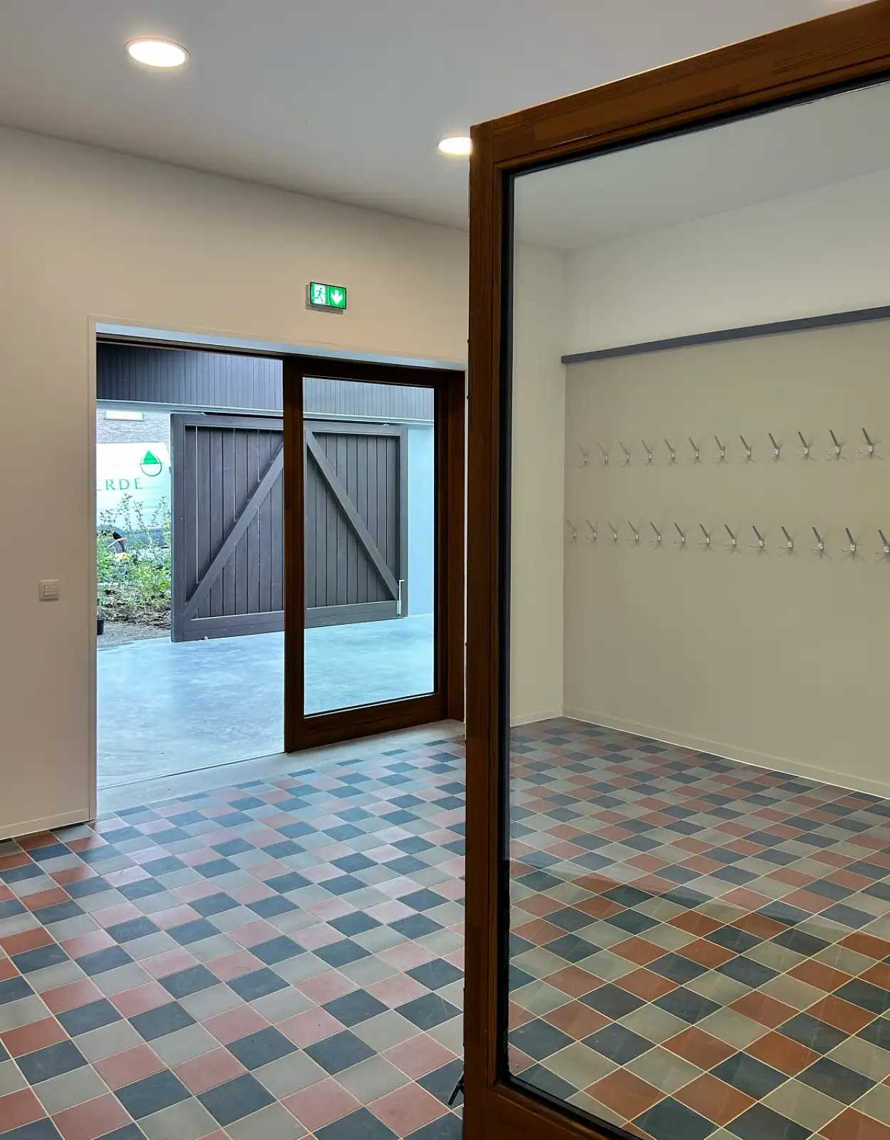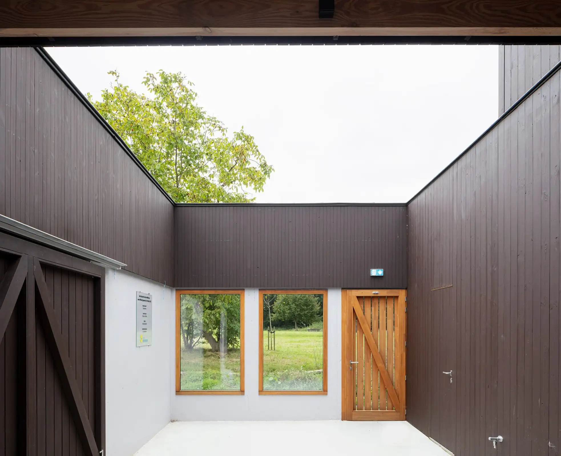 Het nieuwe centrum is bijna energieneutraal en dus duurzaam en ecologisch getransformeerd met een doorgedreven circulariteit tijdens af- en opbouw. De funderingen en buitenschil werden gerecupereerd. De betonbalken zijn opnieuw gebruikt als waterdoorlatende verharding, als banken, als verlichtingspaal. De onderfundering van de voormalige koer is gebruikt voor de meanderende keermuren met muurbegroeiing. Dit project is een samenwerking met murmuur architecten waar eenvoud en praktische wendbaarheid samengaan.