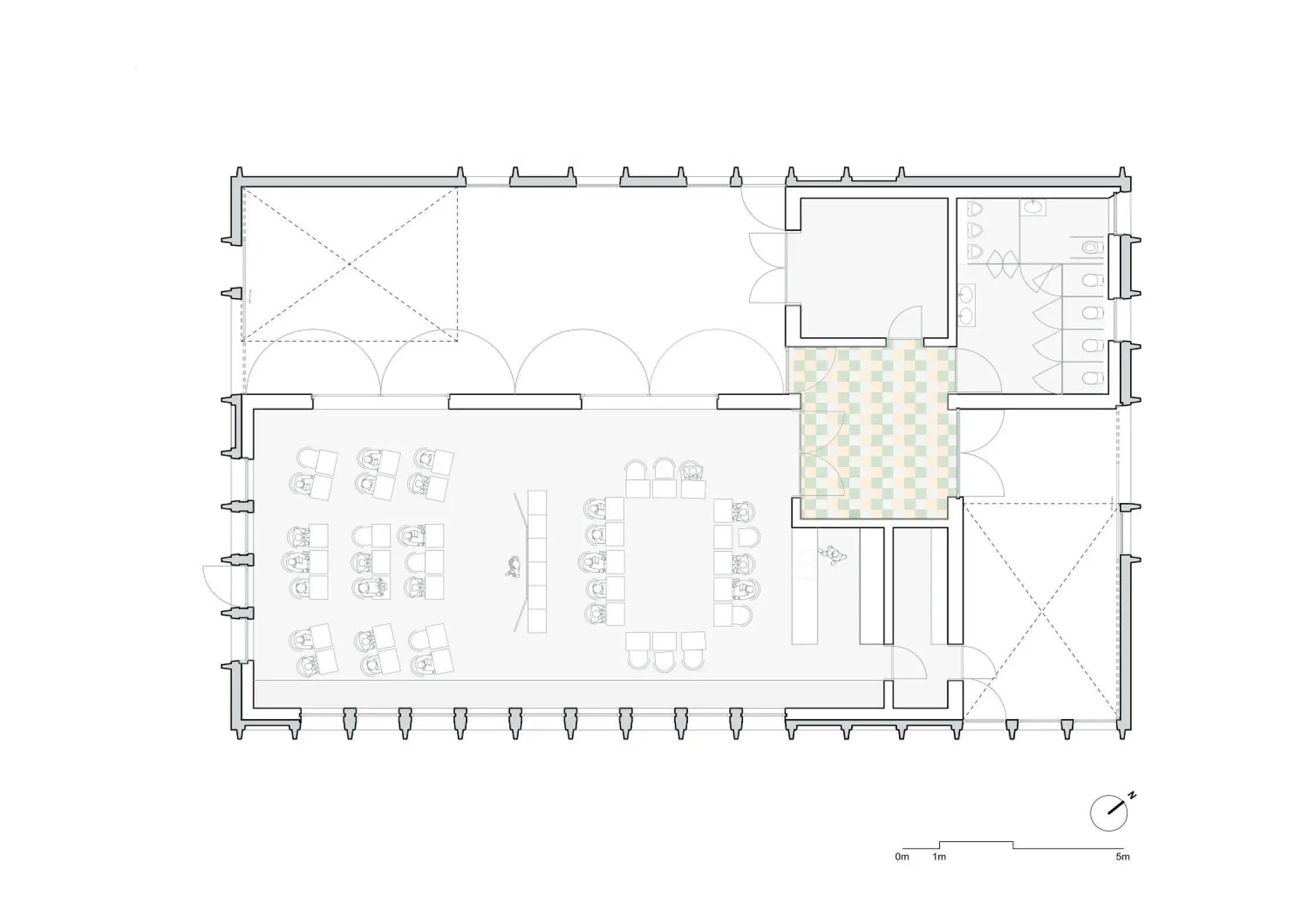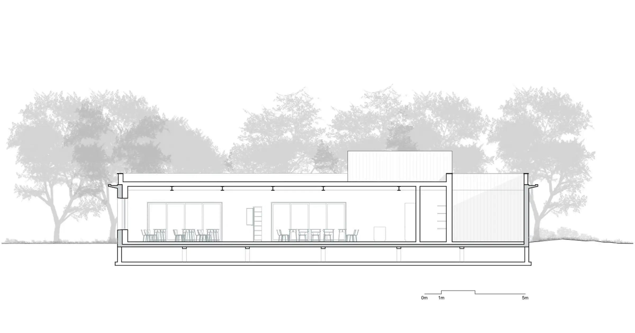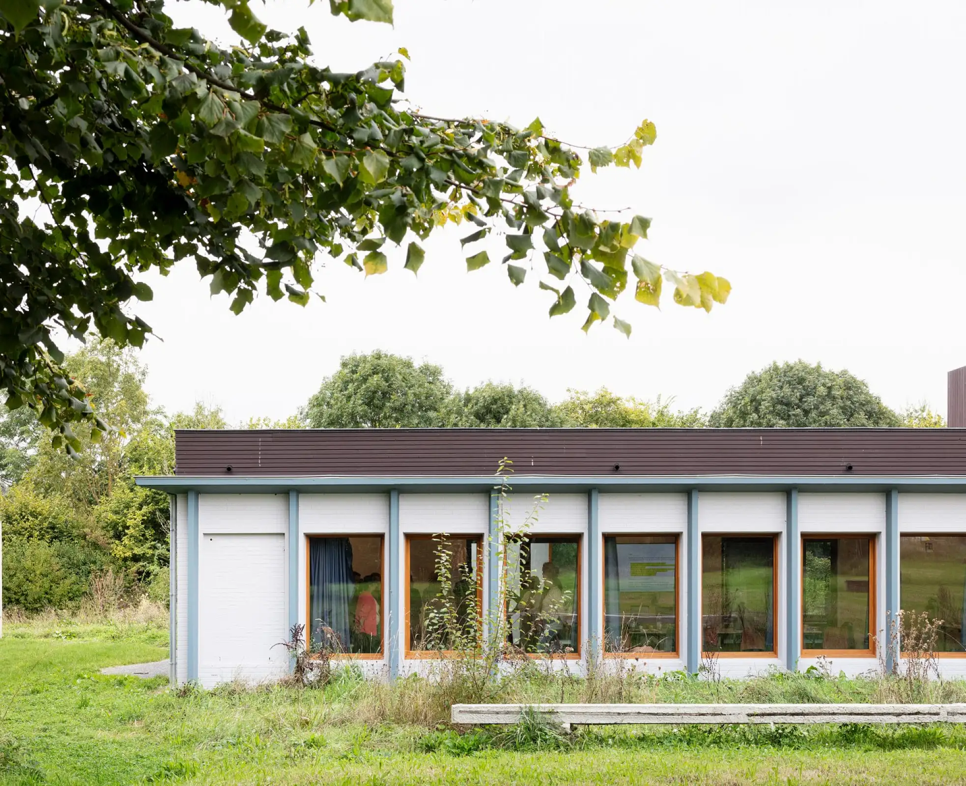 Dit voormalig schooltje van het gemeenschapsonderwijs kan als een prototype dienst doen hoe men circulair kan transformeren. De belangrijkste ingreep zijn de patio’s die een schakel vormen tussen het omringende park en het gebouw. Het gebouw flirt met de grenzen tussen binnen en buiten. De binnen- en buitenruimtes vormen een flexibel kader die de gebruikers multifunctioneel kunnen invullen als tentoonstellingsruimte, als buurtcentrum, voor plaatselijke verenigingen, voor naschoolse opvang…