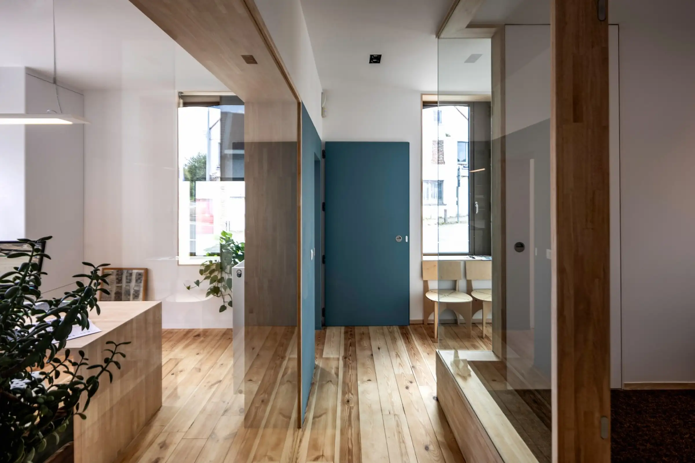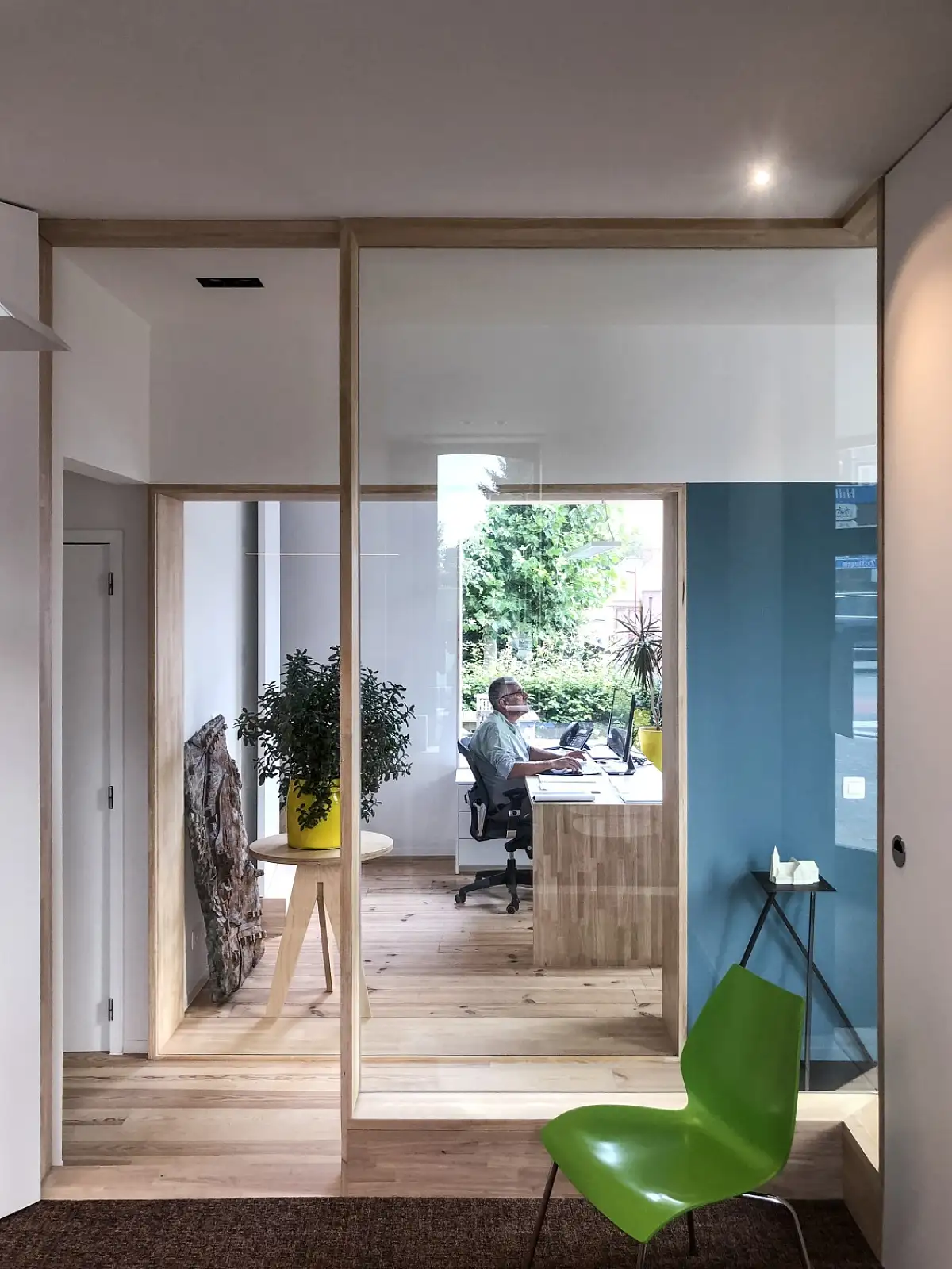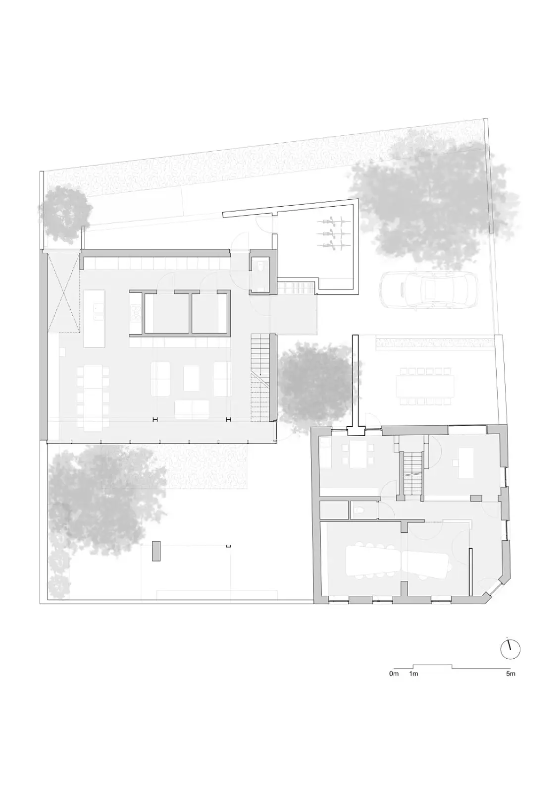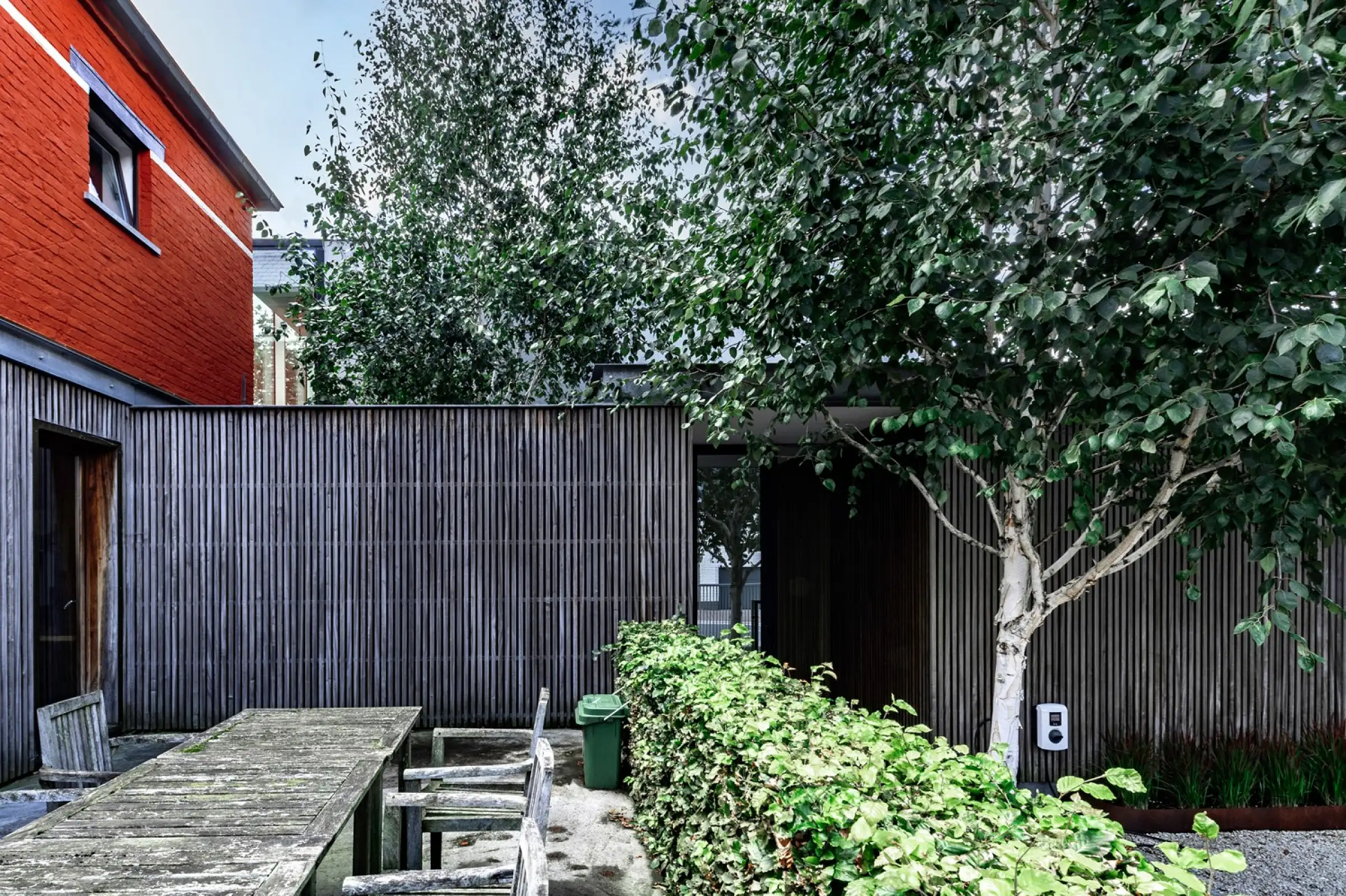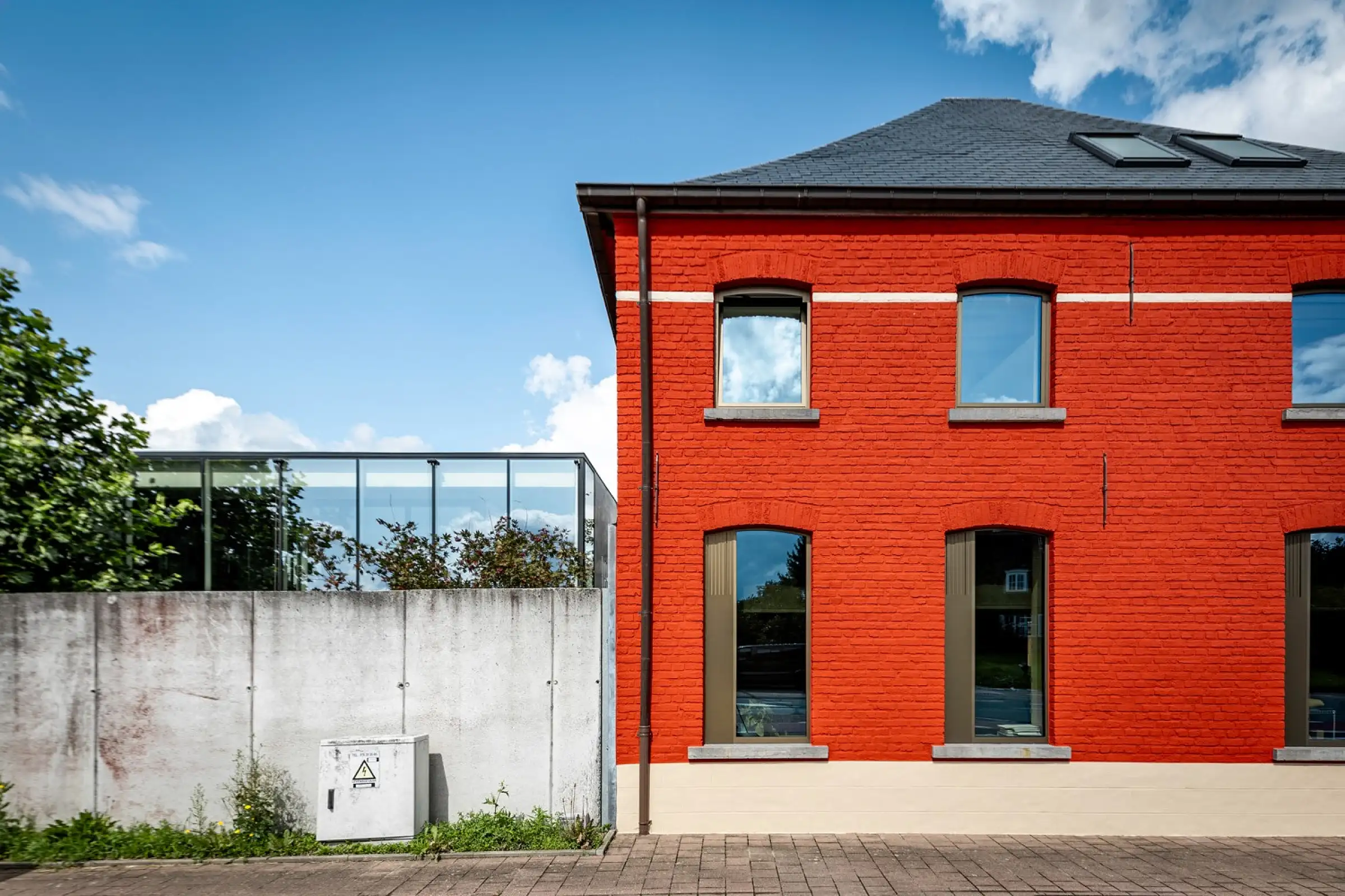 Een hoekperceel tussen twee steenwegen is het tafereel waar AiT woont en werkt. Na een parcour van 10 jaar zijn we geïnstalleerd. Het oude hoekhuis was eens het gemeentehuis met de post en een café. Daarna werd het een woning, nu is het getransformeerd naar ons kantoor. Diametraal werd in de andere hoek van het perceel de woning ingeplant met een open plan en dubbele gevel. De belangrijkste reden van ontdubbeling van de zuidelijk beglaasde gevel is akoestiek. De nieuwbouw volledig in zichtbeton langs de binnen- en buitenzijde heeft een grote thermische capaciteit. Door de diametrale inplanting van de twee gebouwen ontstaan twee negatieve ruimtes: een inkompatio aan de Oombergenstraat en een groene oase langs de Steenweg op Aalst.