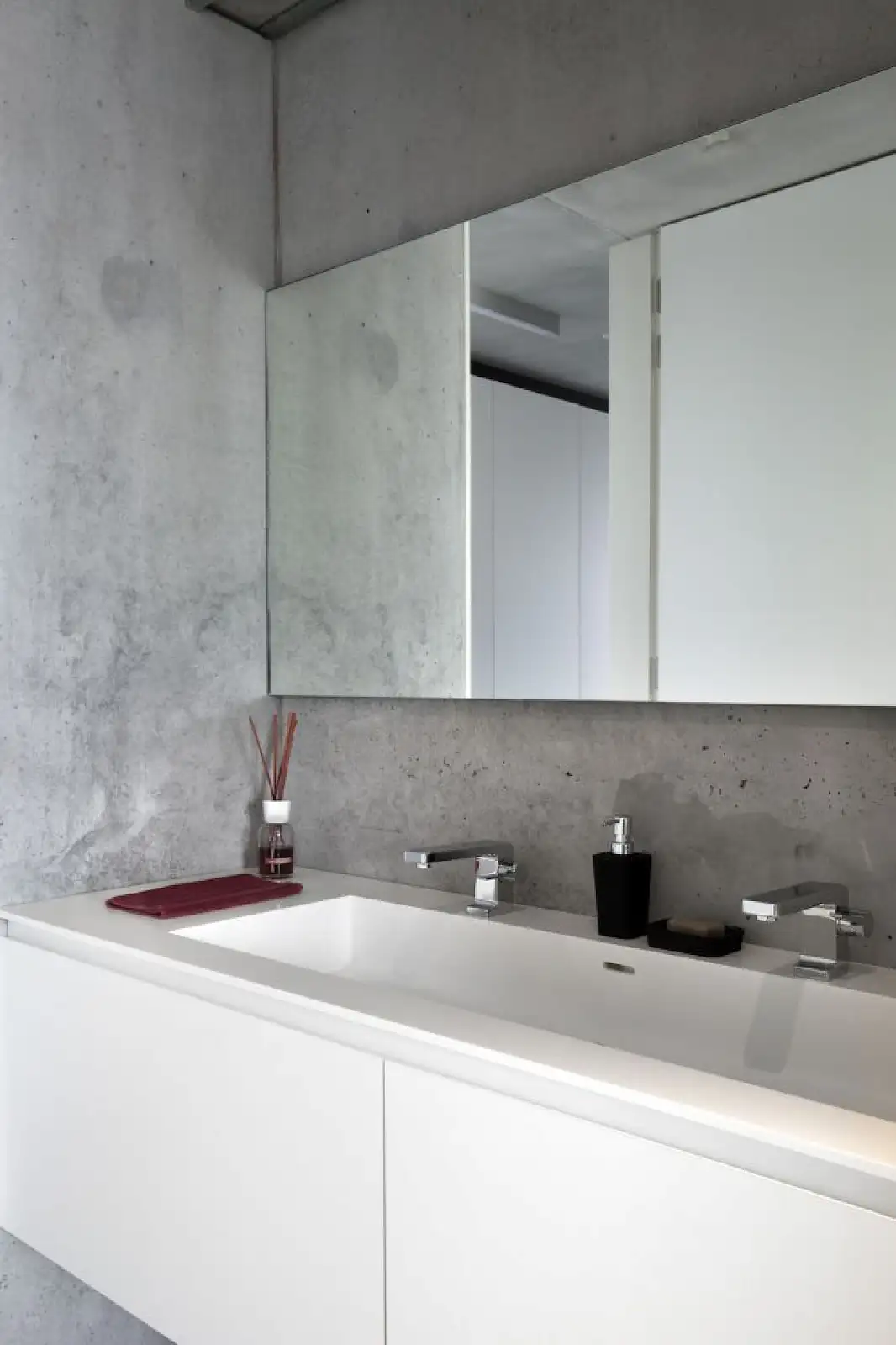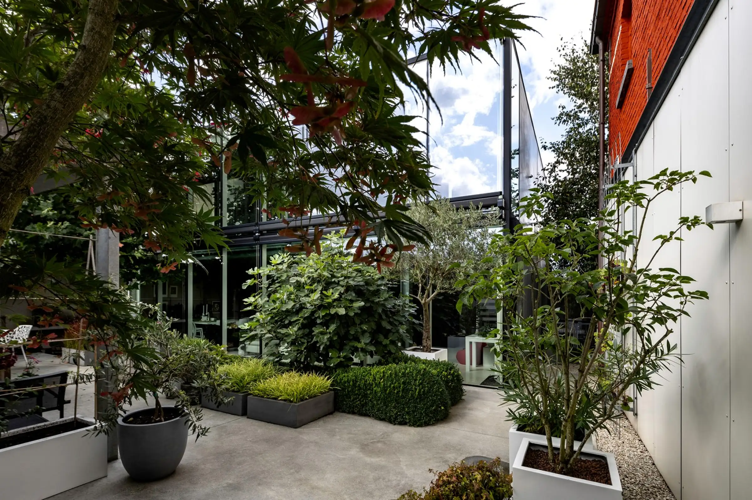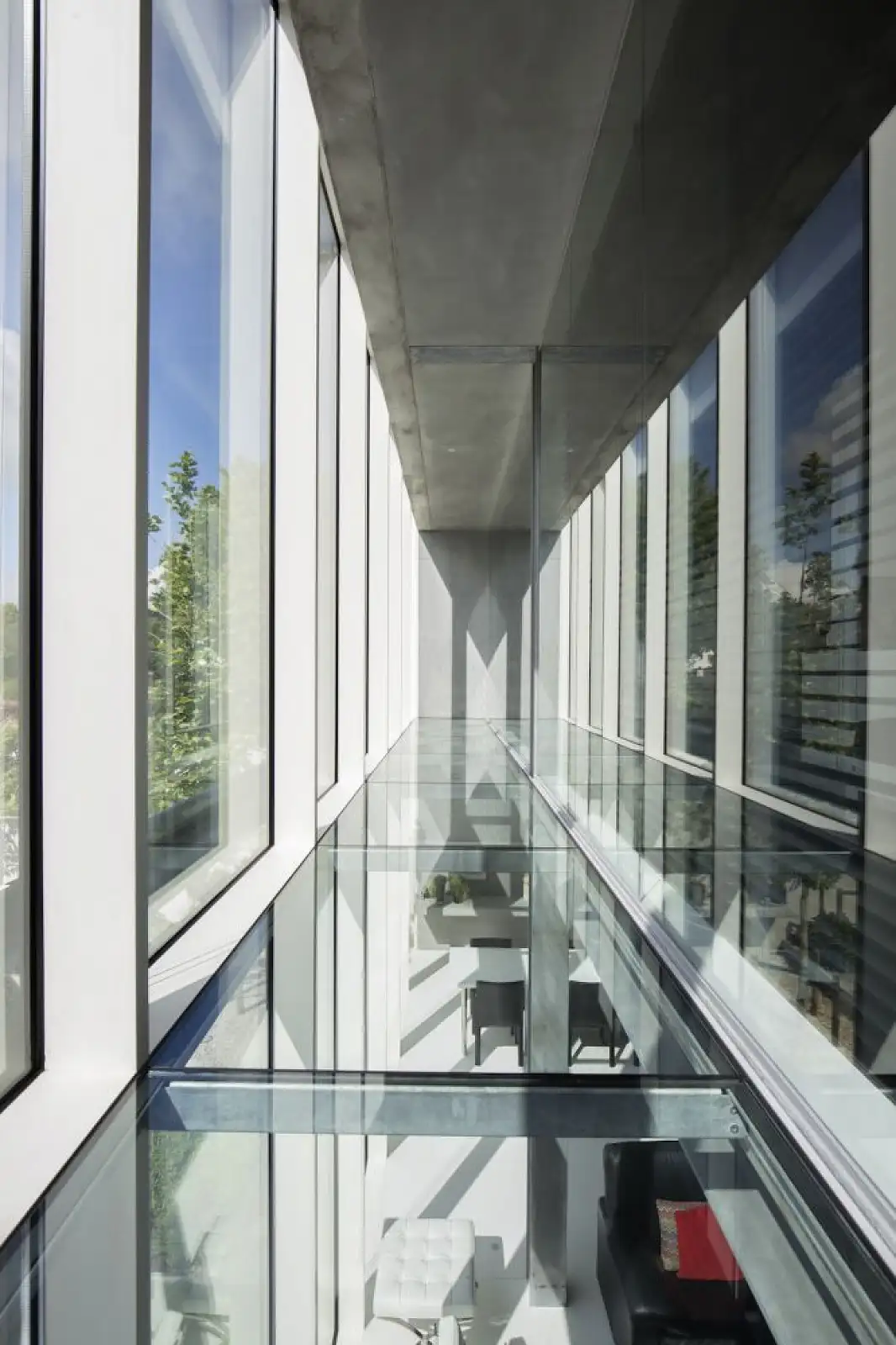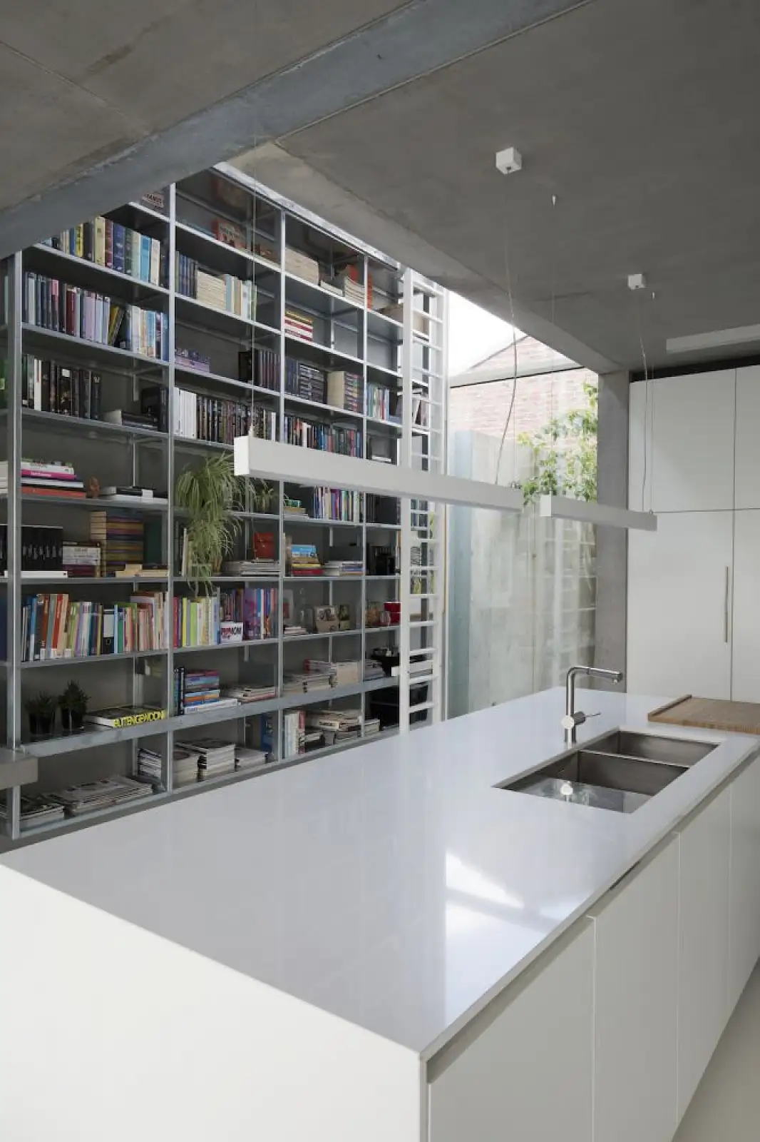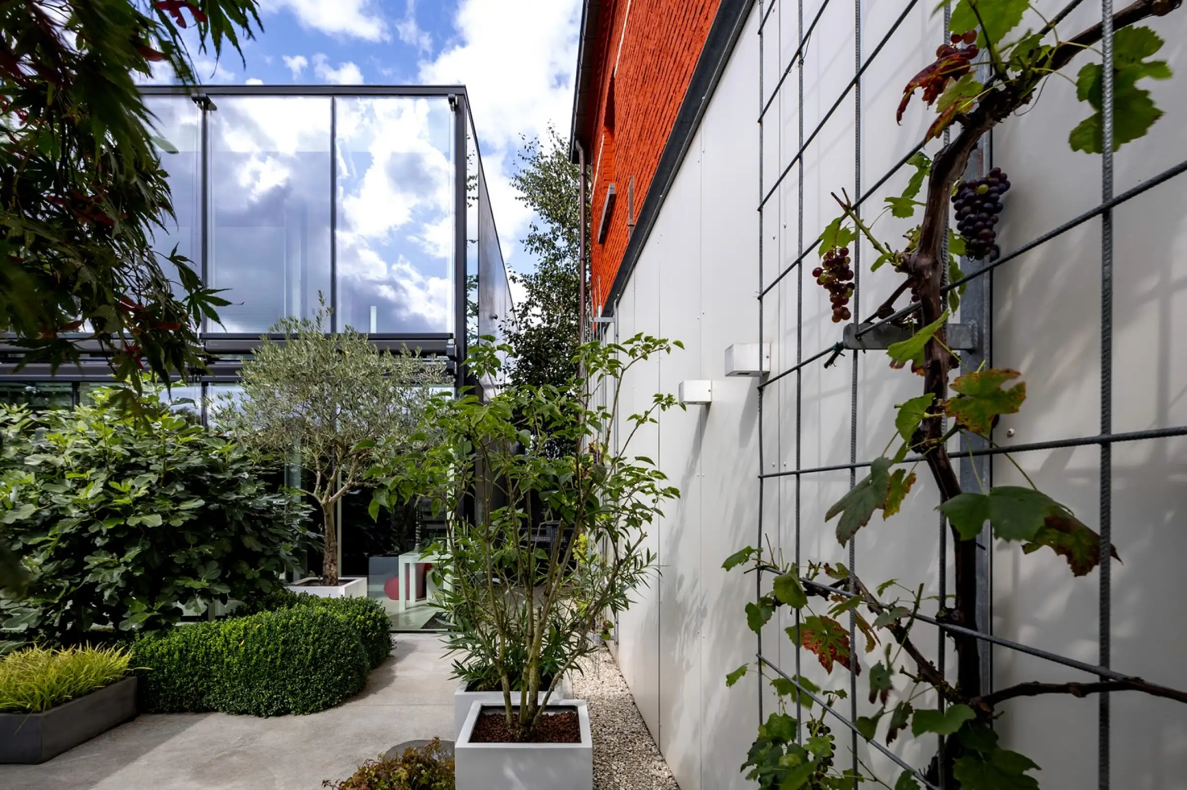 Een hoekperceel tussen twee steenwegen is het tafereel waar AiT woont en werkt. Na een parcour van 10 jaar zijn we geïnstalleerd. Het oude hoekhuis was eens het gemeentehuis met de post en een café. Daarna werd het een woning, nu is het getransformeerd naar ons kantoor. Diametraal werd in de andere hoek van het perceel de woning ingeplant met een open plan en dubbele gevel. De belangrijkste reden van ontdubbeling van de zuidelijk beglaasde gevel is akoestiek. De nieuwbouw volledig in zichtbeton langs de binnen- en buitenzijde heeft een grote thermische capaciteit. Door de diametrale inplanting van de twee gebouwen ontstaan twee negatieve ruimtes: een inkompatio aan de Oombergenstraat en een groene oase langs de Steenweg op Aalst.