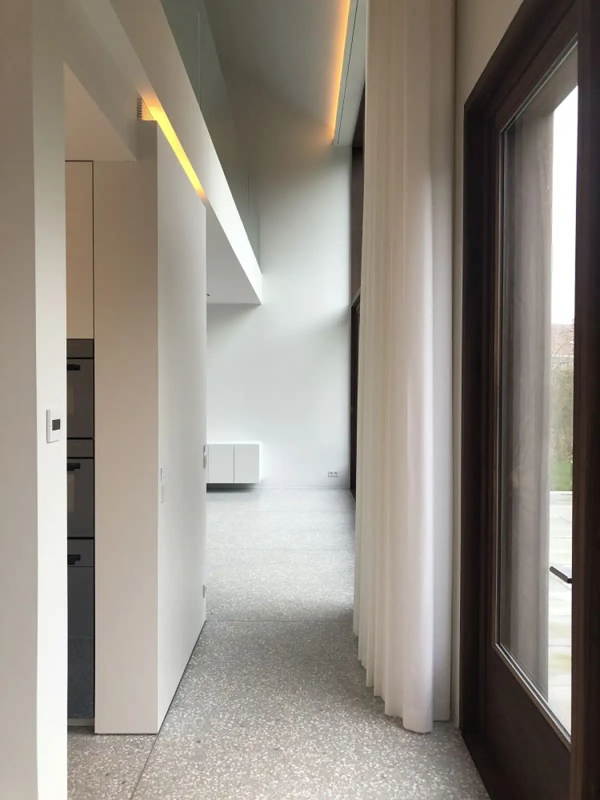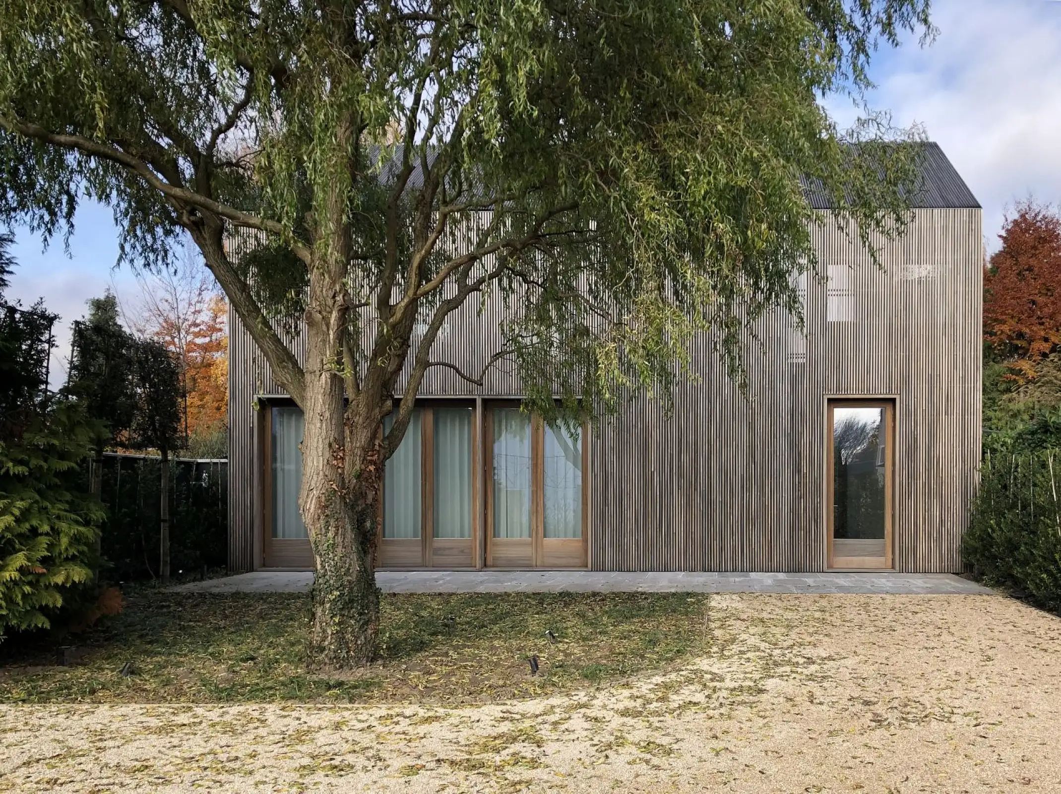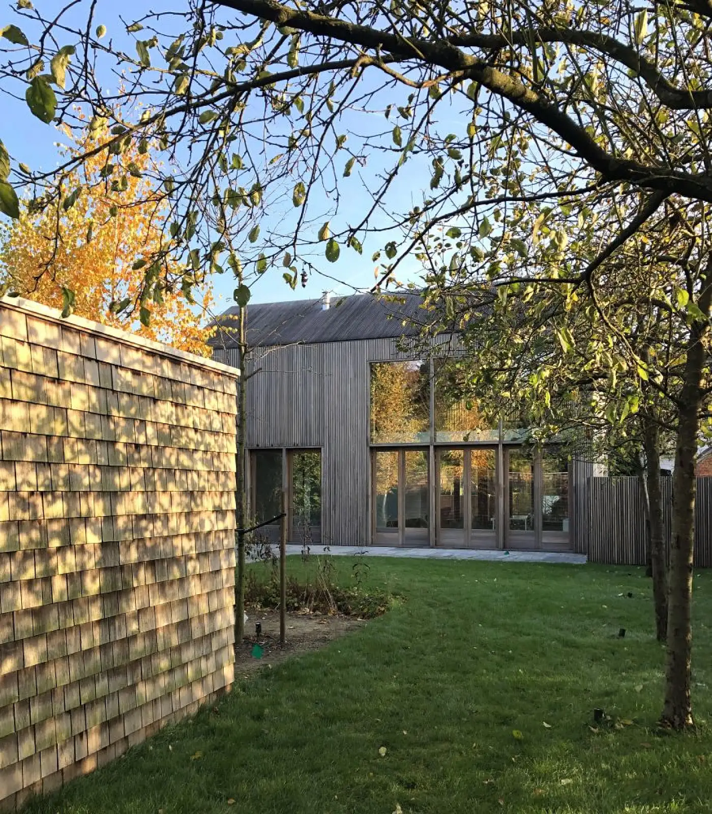 Intuïtief is gekozen om de hofstede te behouden, te verbouwen en te herbestemmen tot kantoor. Het werd een evenwichtsoefening tussen gesloten, transparante en semi-transpartante delen ergens halverwege de voor- en achtertuin.
