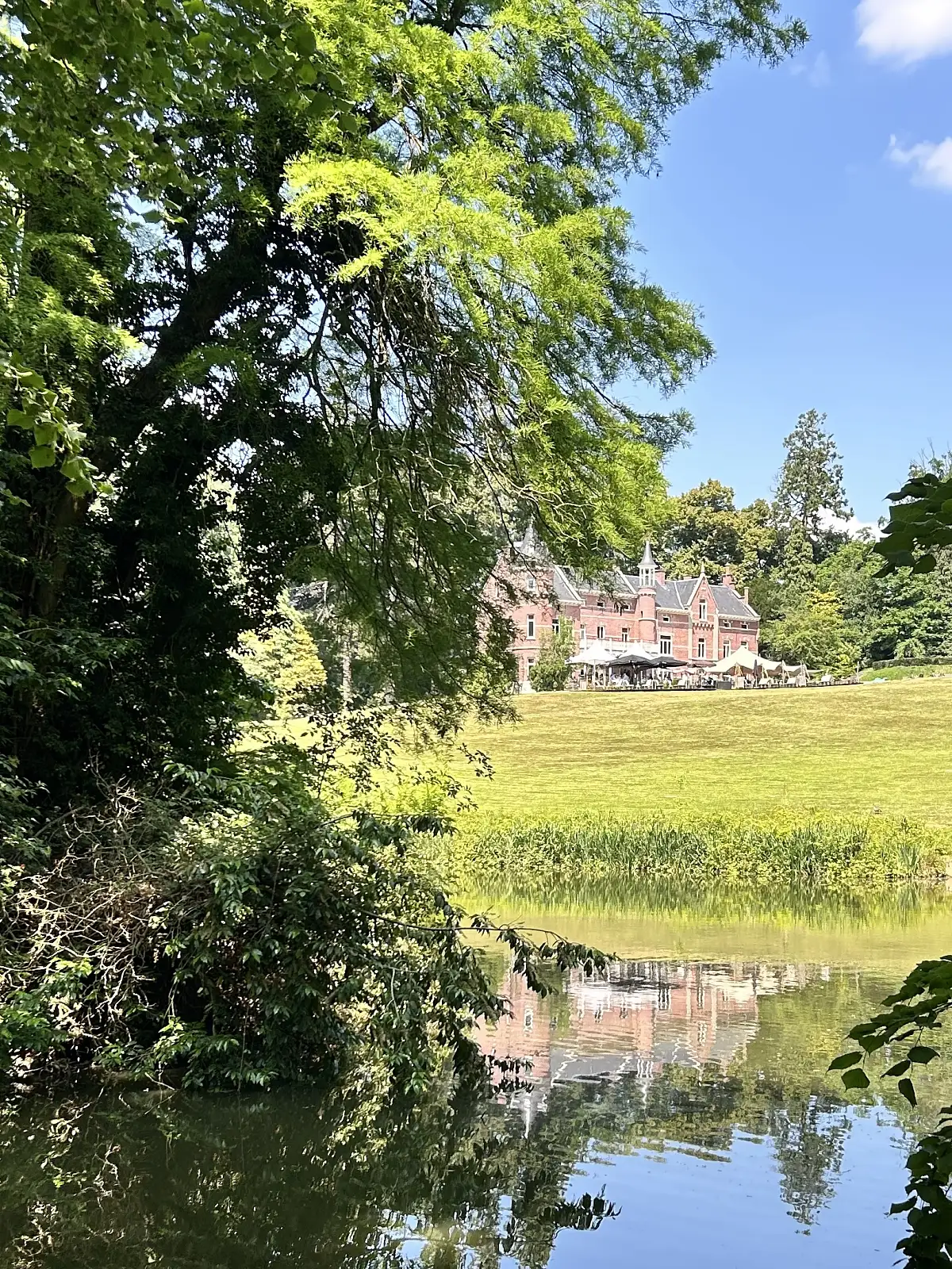 Het park in Engelse landschapsstijl bevat dertien vijvers in cascade verspreid over een boven- en benedenbekken met centraal de grote spiegelvijver met het eiland. Bovenaan de spiegelvijver staat het kasteel dat afgelopen deccenia als horeca functioneert.