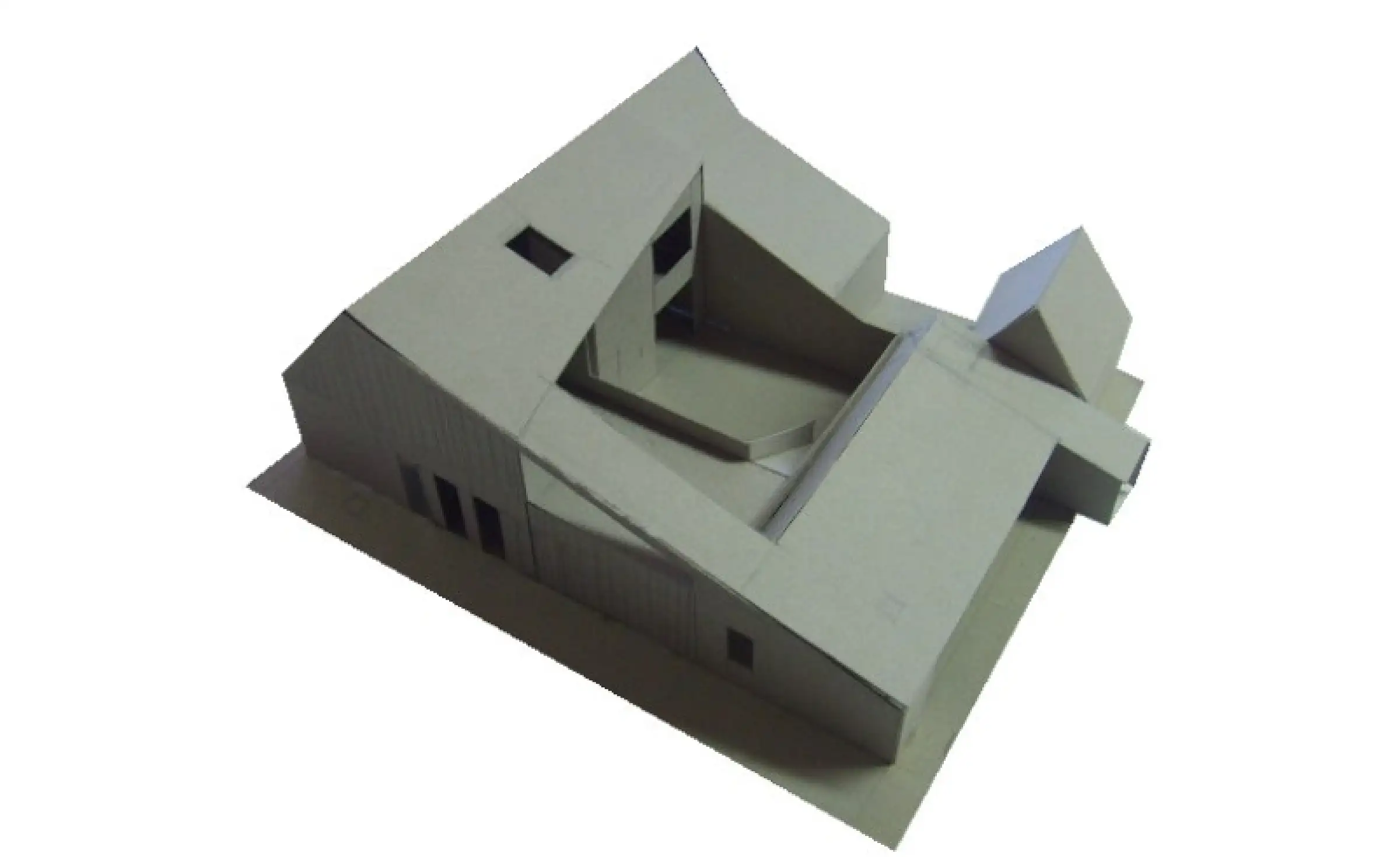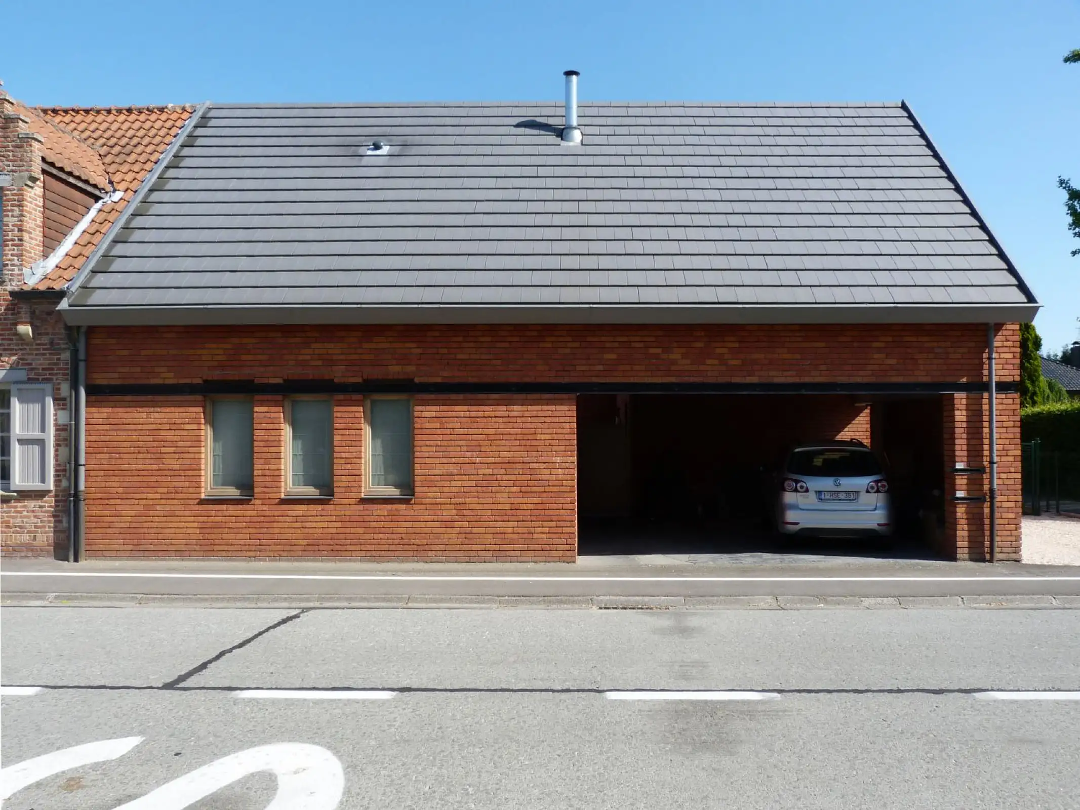 Twee woningen voorrespectievelijk de ouders en de dochter zijn rond een patio gevouwen en vormen een creatieve oefening binnen een traditioneel gabariet. De 2 wooneenheden worden door het expressieve dakvlak verbonden en waargenomen als één geheel.