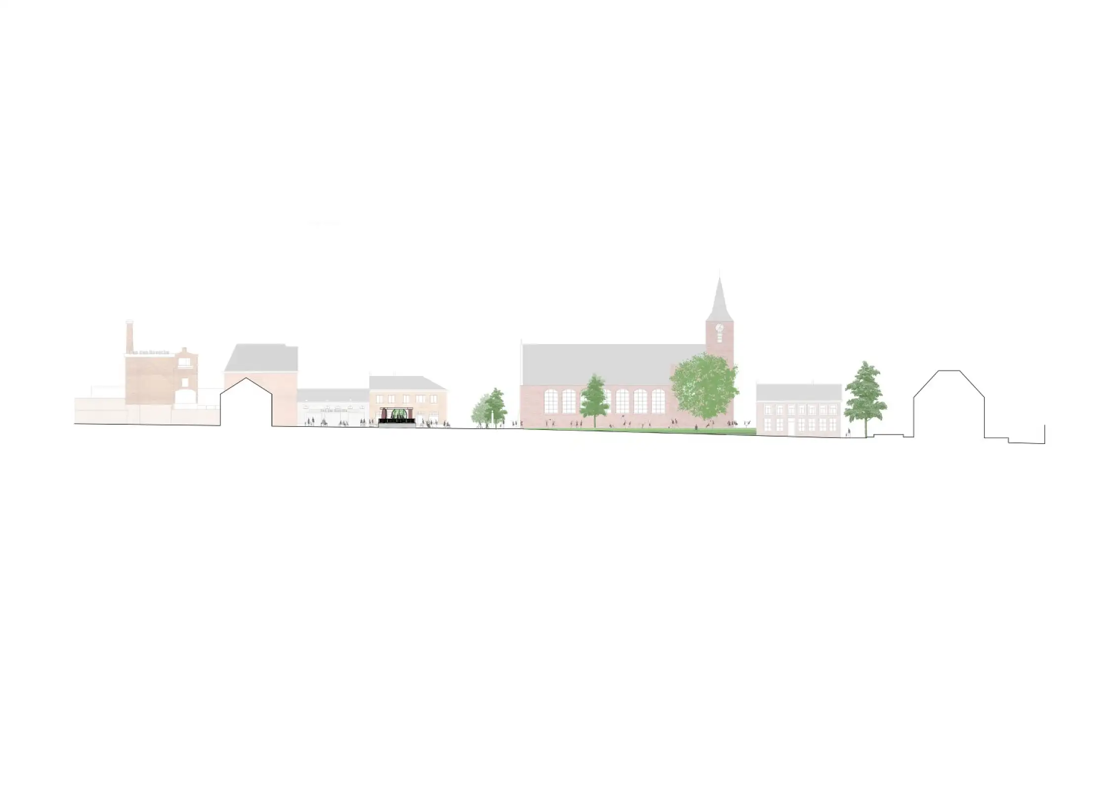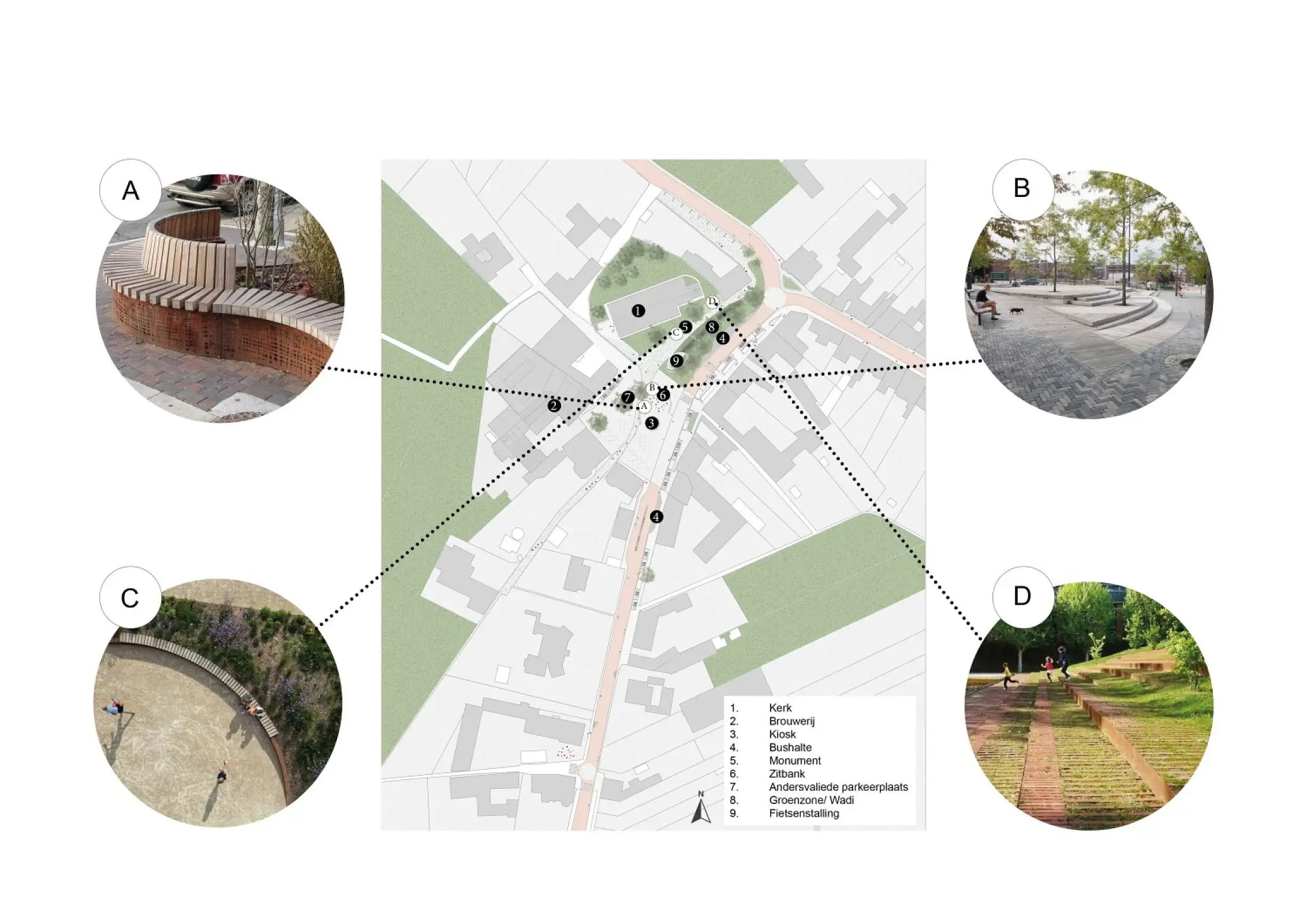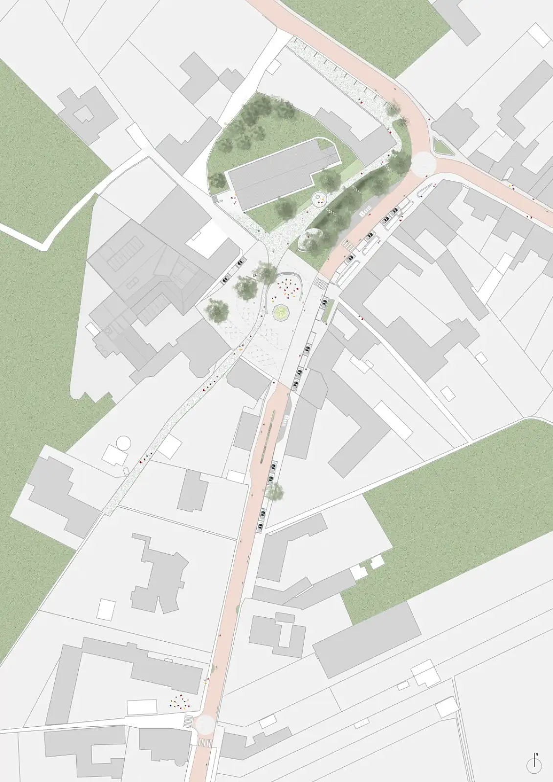 De onderzijde van het plein wordt onthard en vergroend tot een wadi met attractieve en creatieve waterelementen en bloemrijkgraslandschap. Deze groene wadi vormt samen met het bestaande groen rond de kerk een groen beneden plein. De kiosk is de kern van het verharde plein, het oorlogsmonument is de kern van het groene plein. De kwalitatieve materialen en organisatie van het plein worden zoveel mogelijk behouden of gerecupereerd. Dwars over het plein van boven naar beneden wordt parallel langs de kerk een nieuwe bomenrij geplaatst met centraal de te behouden dorpslinde als toekomstboom.