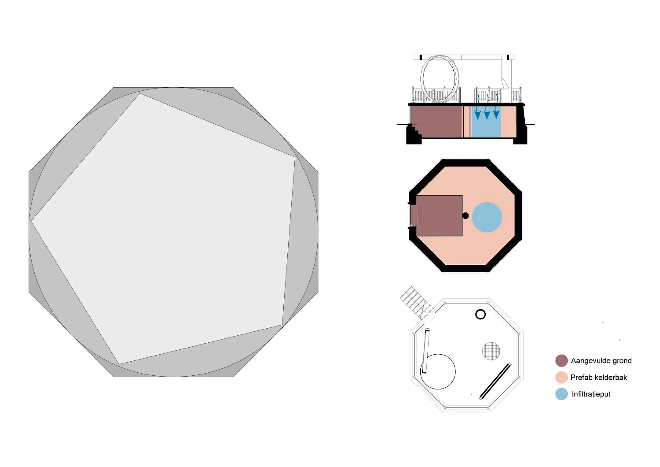 De nieuwe bovenbouw is geometrisch benaderd. De horizontale pergolastructuur is een ingeschreven vijfhoek van de ingeschreven cirkel van de achthoekige basis. De vijfhoek hangt 3 meter boven de sokkel en wordt ondersteund door drie cirkelvormige elementen. De ene cirkel is open en vormt een maaswerk voor de klimplant (hop of jasmijn). De andere cirkel refereert naar de metalen gistkuipen die zich onderaan de brouwerij bevinden. Dit is een gesloten cirkel die een wand vormt met de naastliggende rijweg. De derde cirkel is een betonnen zuil in rood gepigmenteerd beton als een boomstam waarbij met een bijl of boomzaag een wig is ingemaakt. Deze wig is de (drinkwater)fontein. Er ontstaat een vrije flexibele maar geborgen ruimte op het plein waar het zonlicht in het filigraan net van de kleurrijke seizoensgebonden klimplant een feeëriek lichtspel creëert.