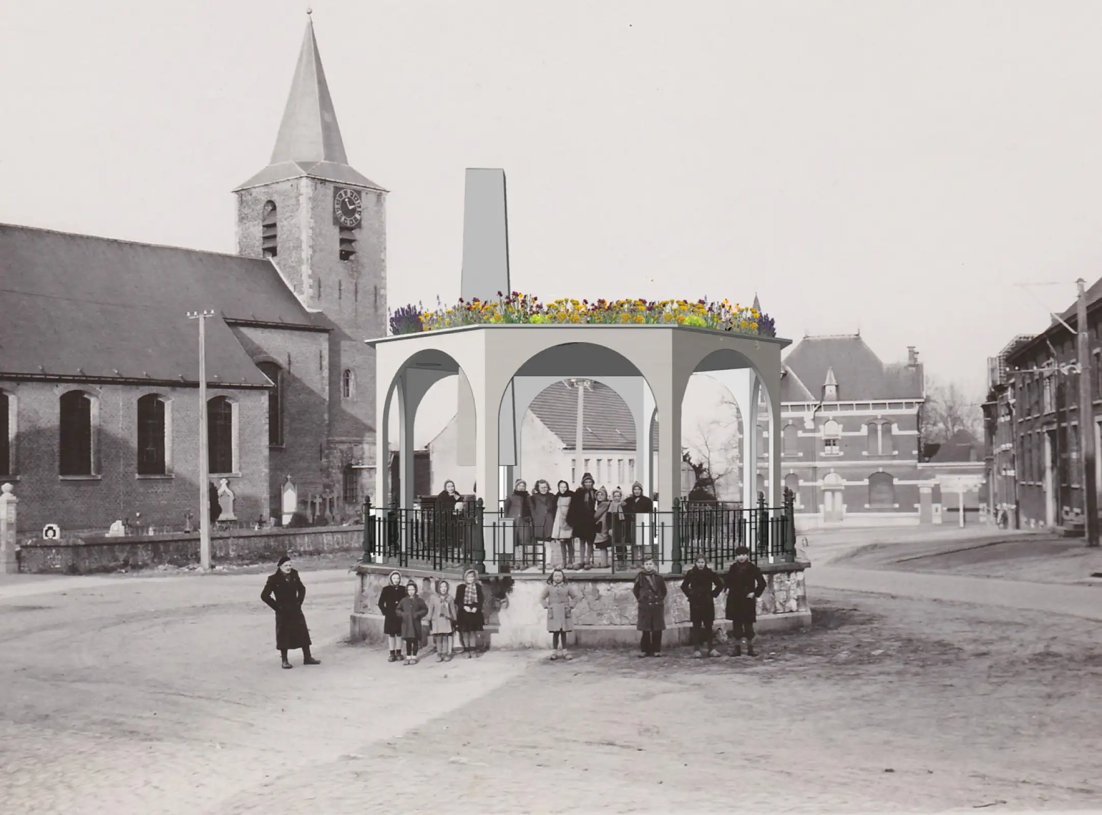 De fontein is het verbindend element in de nieuwe kiosk in functie van een sociale cohesie. Het ontwerpend onderzoek heeft geleid tot een kunstwerk als nieuwe bovenbouw op de bestaande sokkel, eerder dan een hedendaagse interpretatie te maken van de klassieke kiosk die nooit gebouwd is. Het onderzoek wees uit dat een ‘af’dak niet noodzakelijk is om collectiviteit te stimuleren. De fontein refereert naar de oorspronkelijke paardendrinkplaats en de heilige Livinusbron.