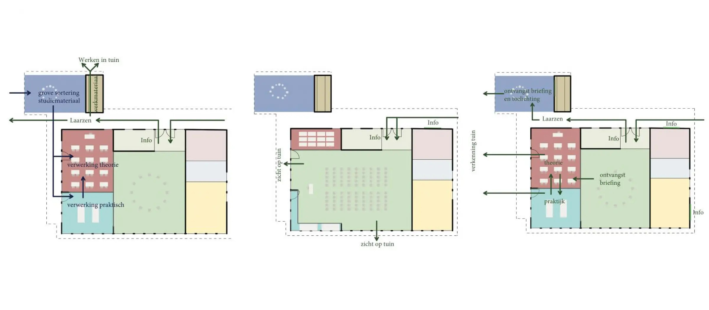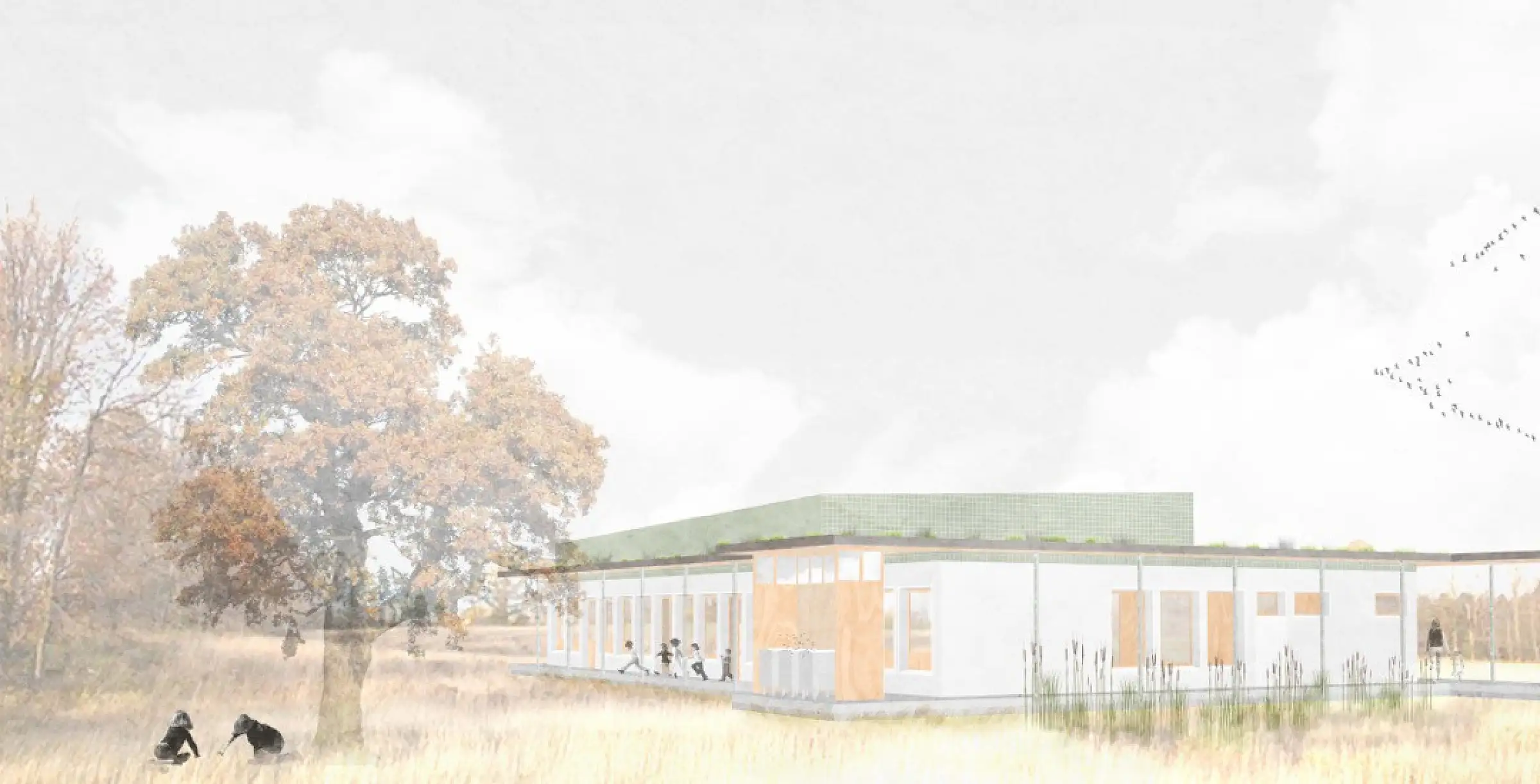 De hoofdcirculatie as geeft uit op het open gazon met amfitheater en waterspeeltuin. De binnenruimte is een flexibele ruimte die met bewegende wanden in verschillende configuraties kan worden verdeeld van kleine klaslokalen tot labo of een keuken voor kookworkshops of een zaal als buurtcentrum. Het gebouw zit subtiel in een natuurlijke helling waarbij op één zijde het groendak naadloos aansluit bij de omgeving. De zaal wordt gemarkeerd door een hoger volume op het groendak waarvan het water wordt gerecupereerd, daklichten extra zon- en daglicht centraal in het gebouw brengen en photovoltaische panelen zijn geïntegreerd. Zowel naar integratie in de omgeving, uitzicht, gebruik als inzake technieken, zontoetreding, beschaduwing vormt het gebouw een totalitair evenwicht.
