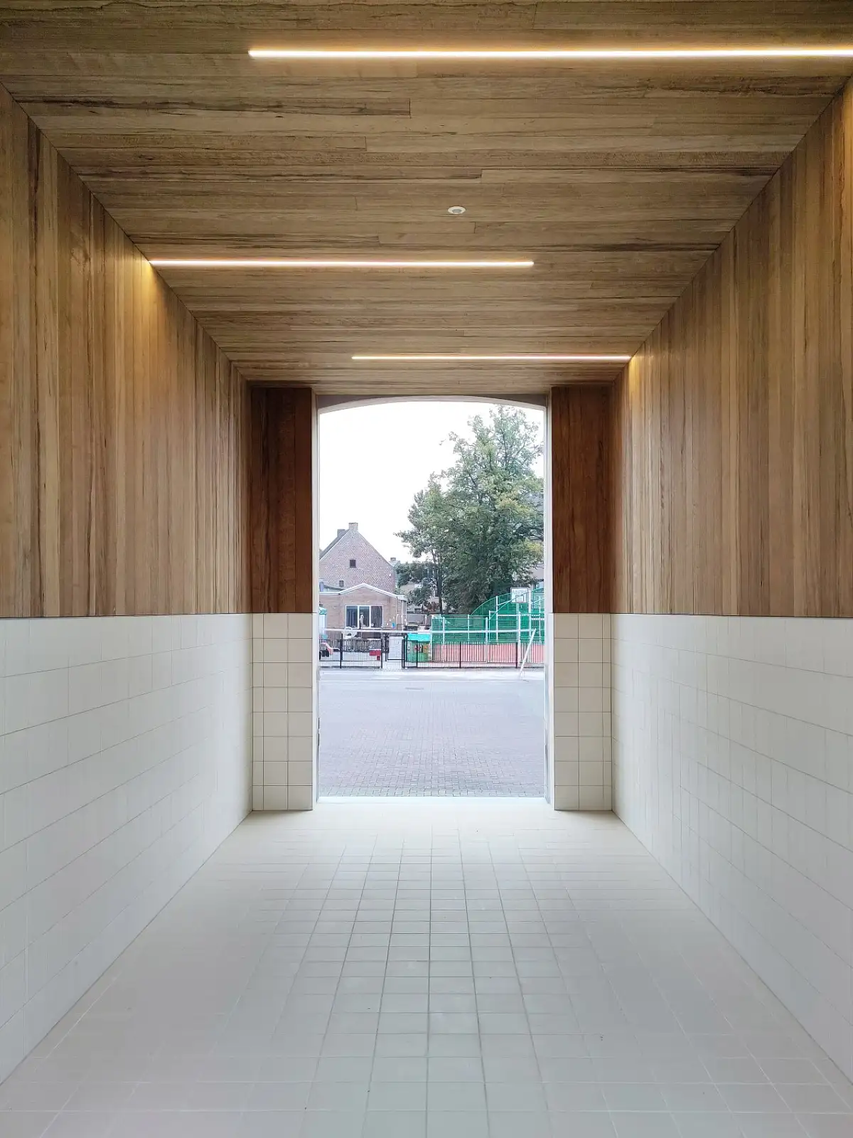 Er is aandacht voor gedifferentieerde en klasoverschrijdende activiteiten: circulaties worden omgevormd tot leerplekken. De leerstraten en doorsteken zijn transitzones tussen klassen en de buitenomgeving. De schoolsite vormt een inspiratievol leerkader - een smeltkroes van architectuur, groen, spel, stilte, verleden en toekomst.
