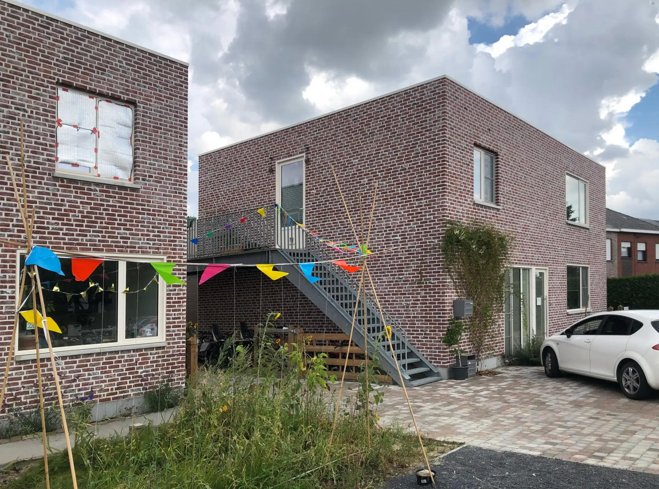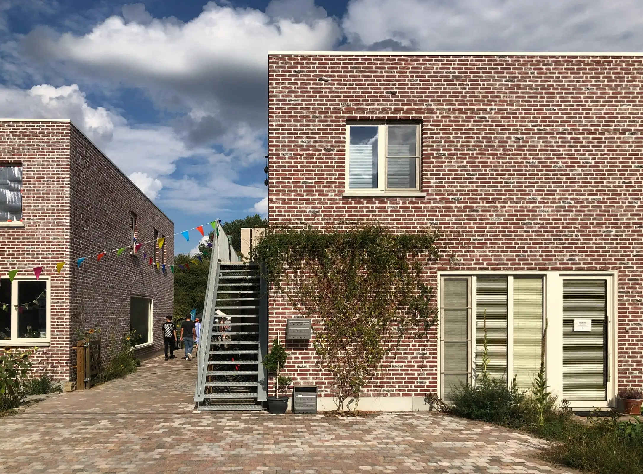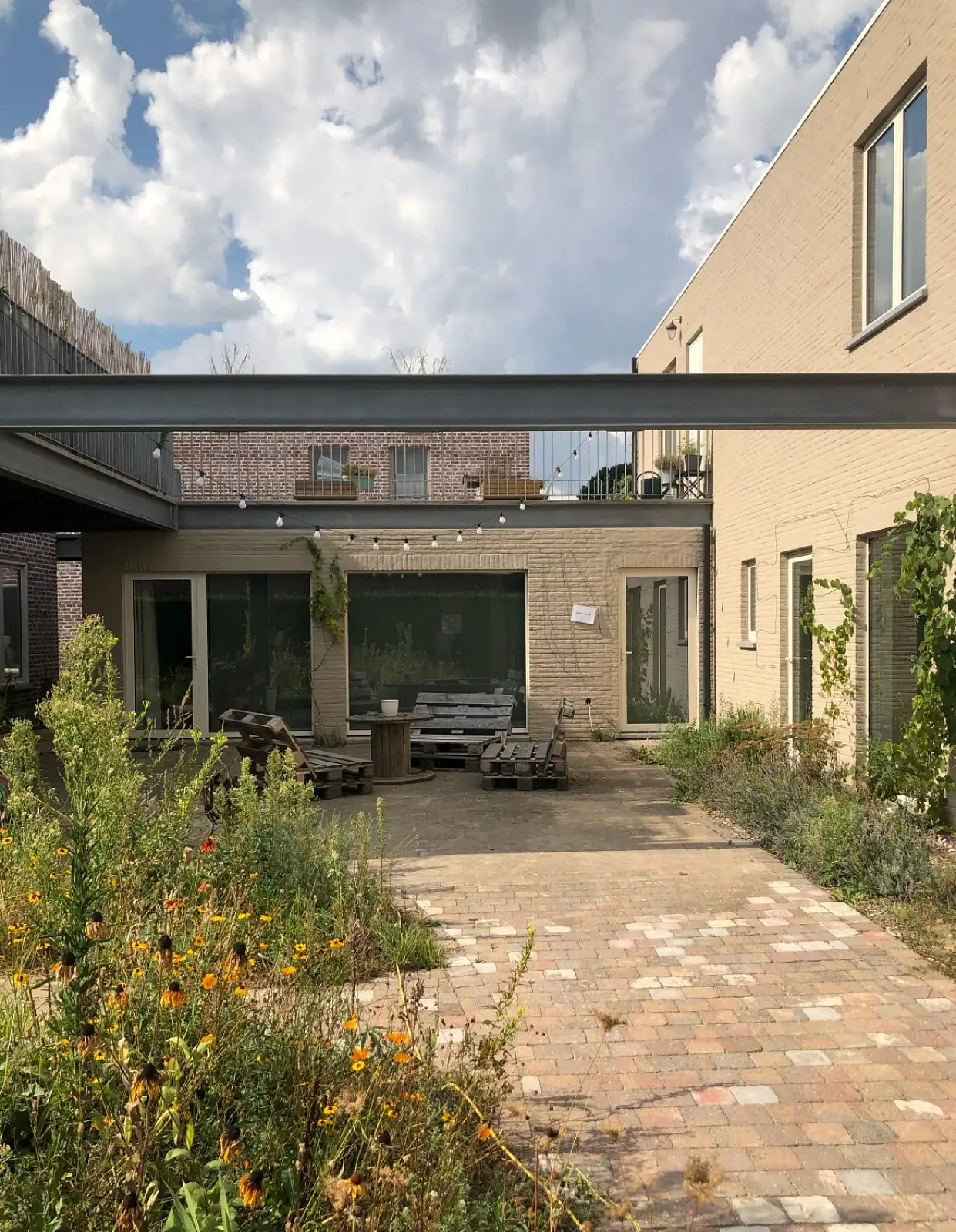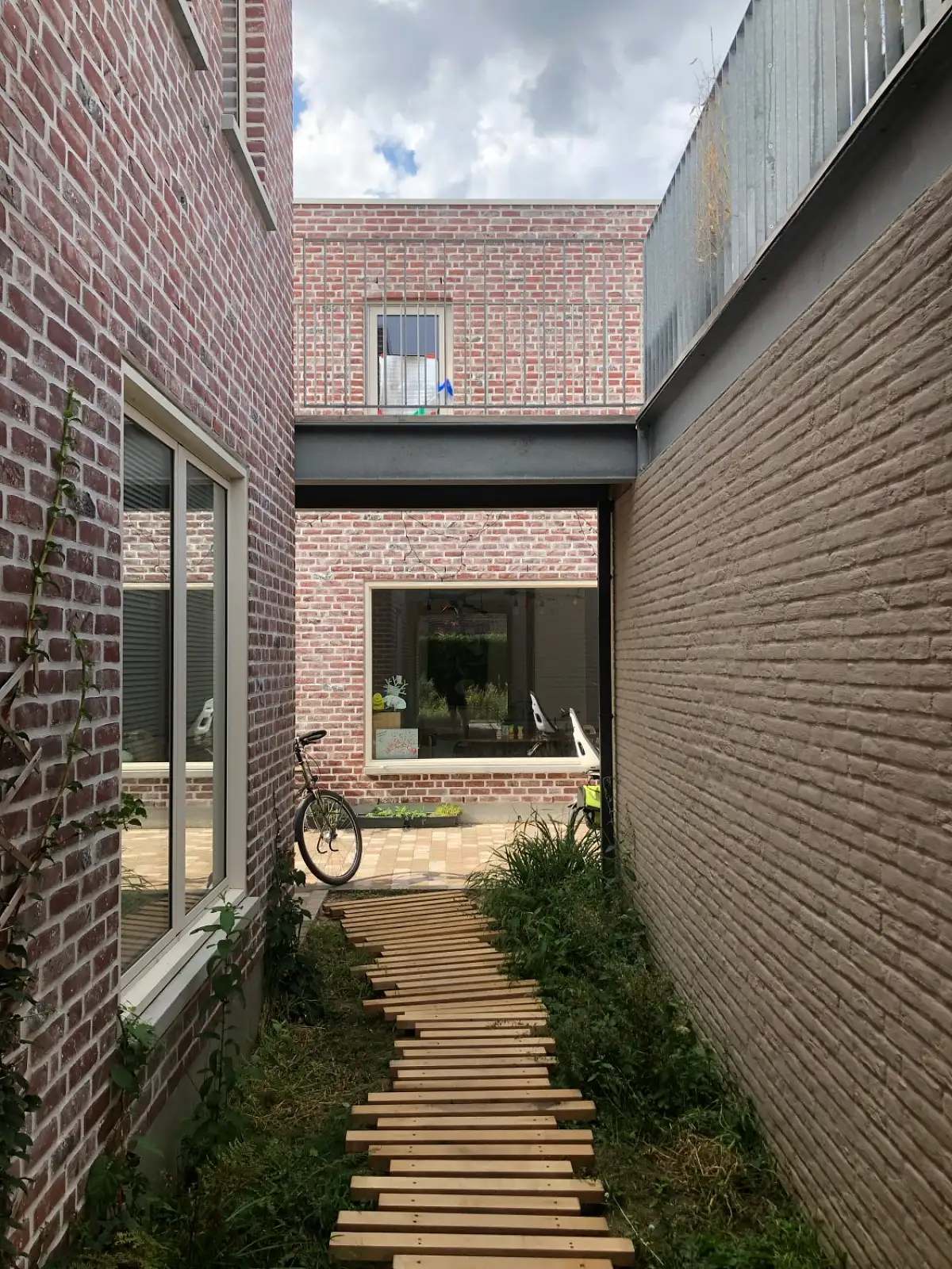 Drie volumes zijn subtiel geschakeld waardoor steegjes en terassen ontstaan met interessante doorzichten en respect voor ieder zijn privacy. De smalle negatieve buitenruimtes zijn belevingsvolle schaduwplekken met water, ruwe stenen, schaduwplanten, stapstenen,... en bundelen tegelijk krachtig zonlicht zodat een minder goede oriëntatie een positieve bijdrage is tot kwaliteitsvolle binnen- en buitenruimtes.