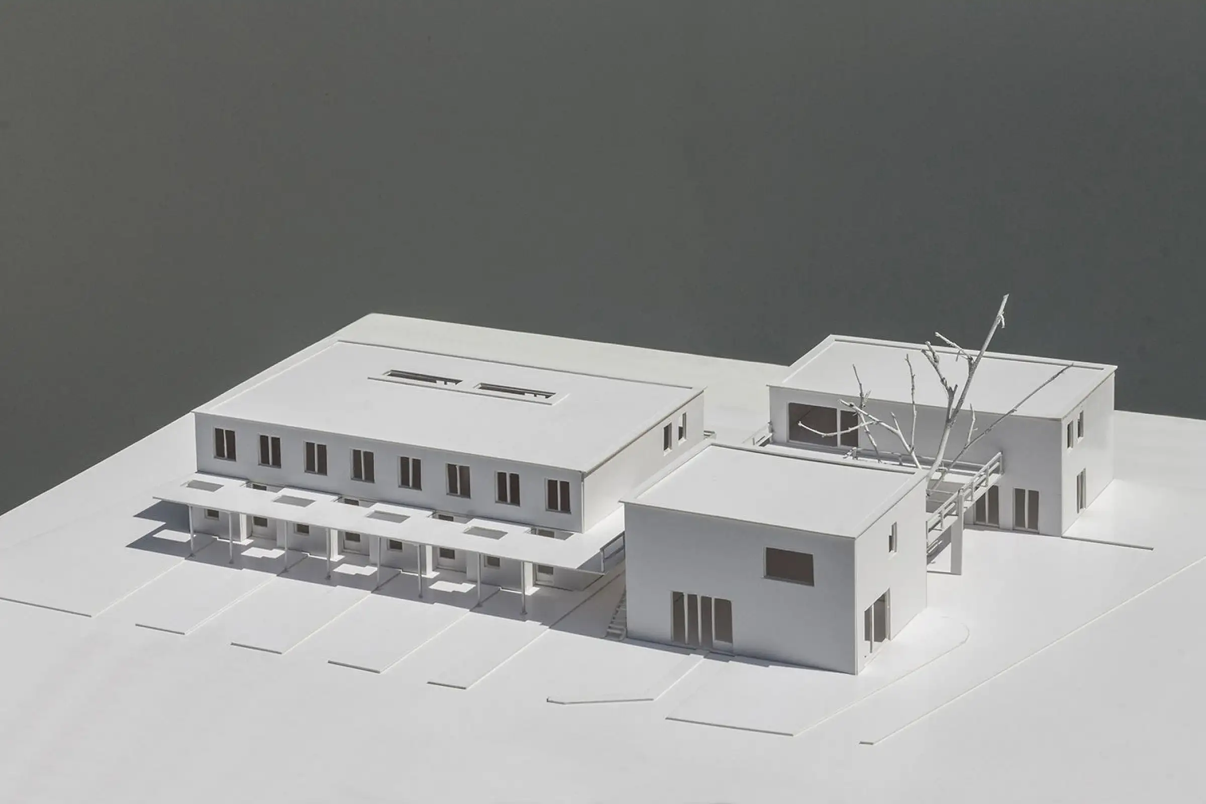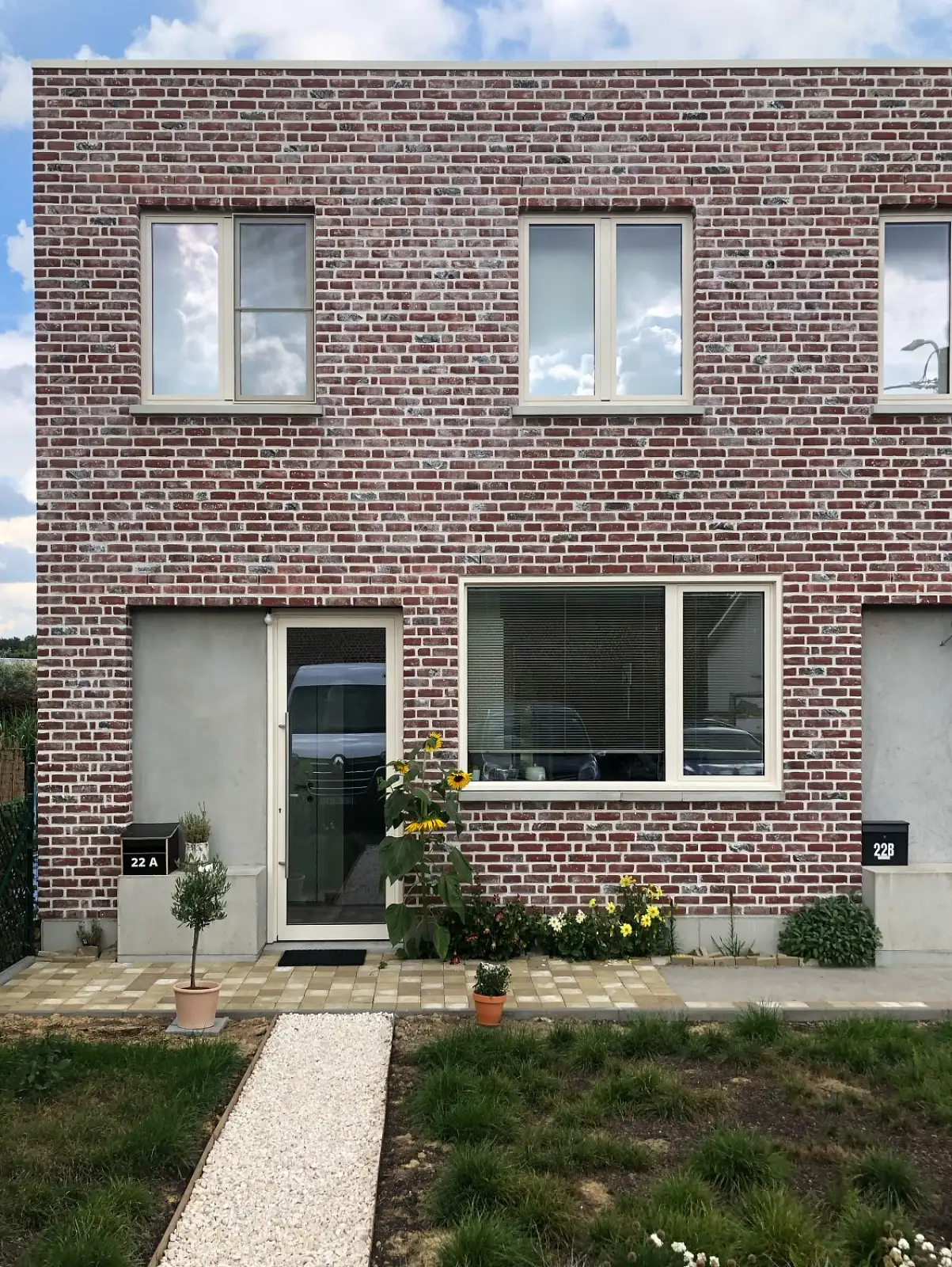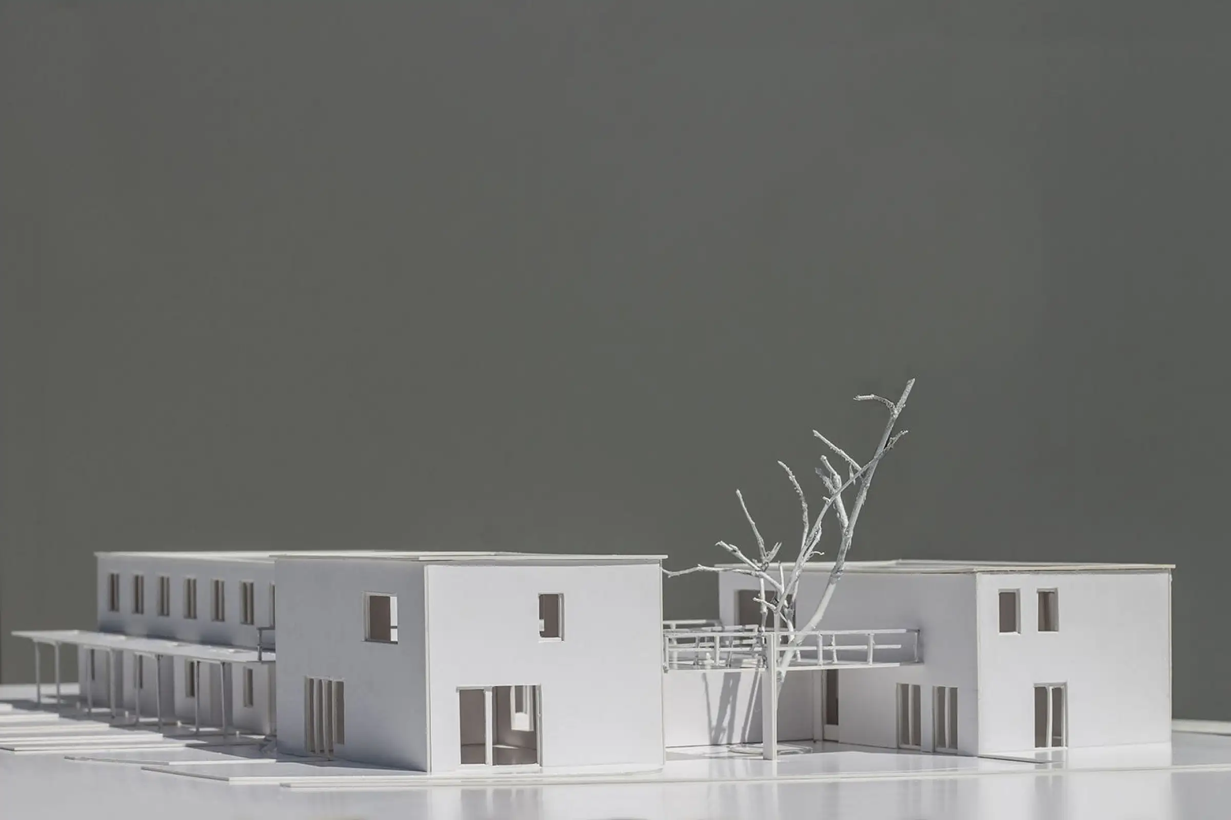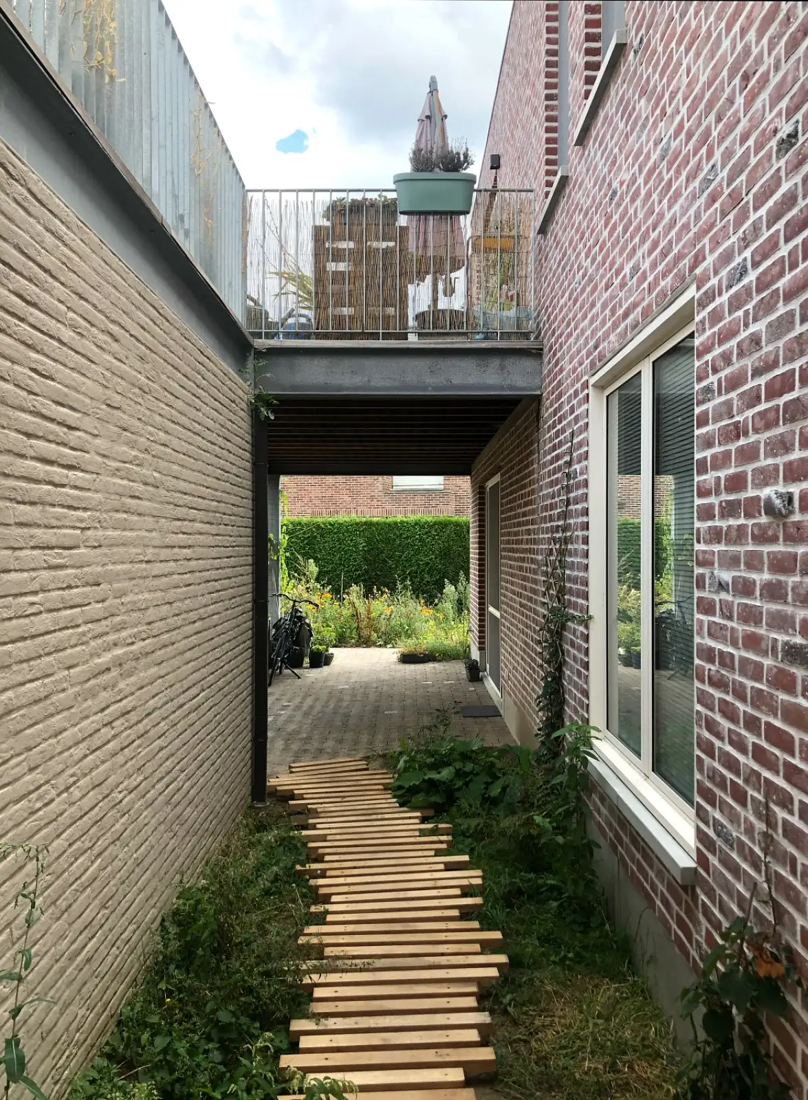 Drie volumes zijn subtiel geschakeld waardoor steegjes en terassen ontstaan met interessante doorzichten en respect voor ieder zijn privacy. De smalle negatieve buitenruimtes zijn belevingsvolle schaduwplekken met water, ruwe stenen, schaduwplanten, stapstenen,... en bundelen tegelijk krachtig zonlicht zodat een minder goede oriëntatie een positieve bijdrage is tot kwaliteitsvolle binnen- en buitenruimtes.