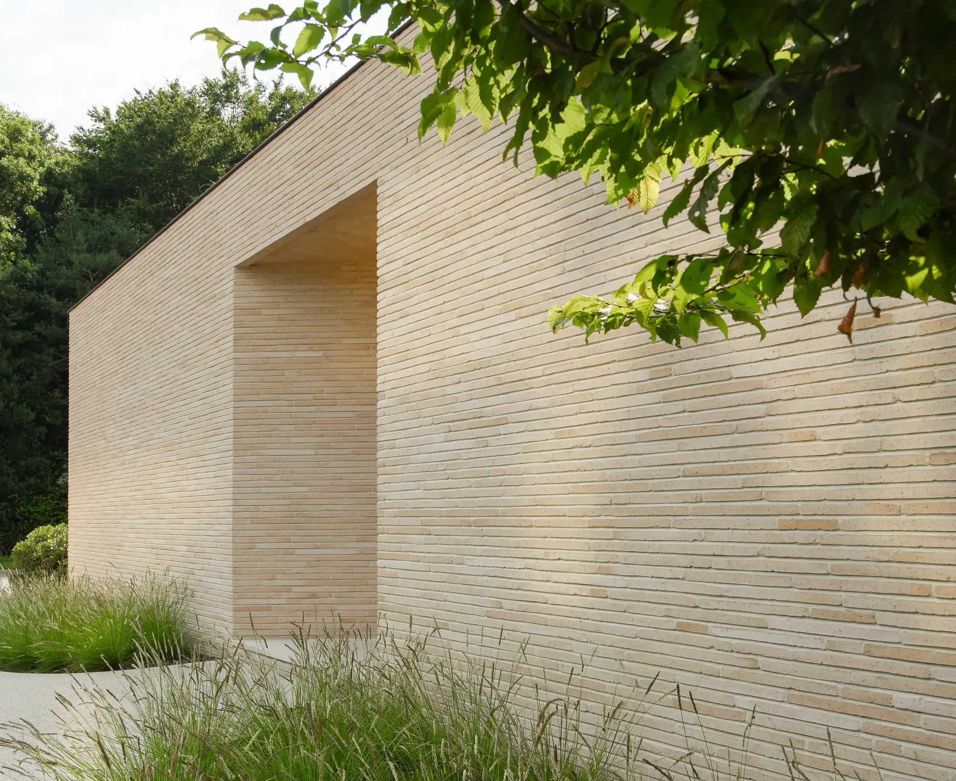 Het gebouw is harmonieus gerenoveerd met authentieke en nieuwe elementen. De directeurswoning is omgevormd tot een kantoorruimte en achteraan uitgebreid met een losstaande woning. De nieuwe woning is een vlakke horizontale schijf in één bouwlaag symmetrisch achter het verticale frontgebouw met een centrale patio. De woning richt zich op het weidse pittoreske golvende landschap, het kantoor manifesteert prompt aan de straatzijde zoals eertijds ontworpen.