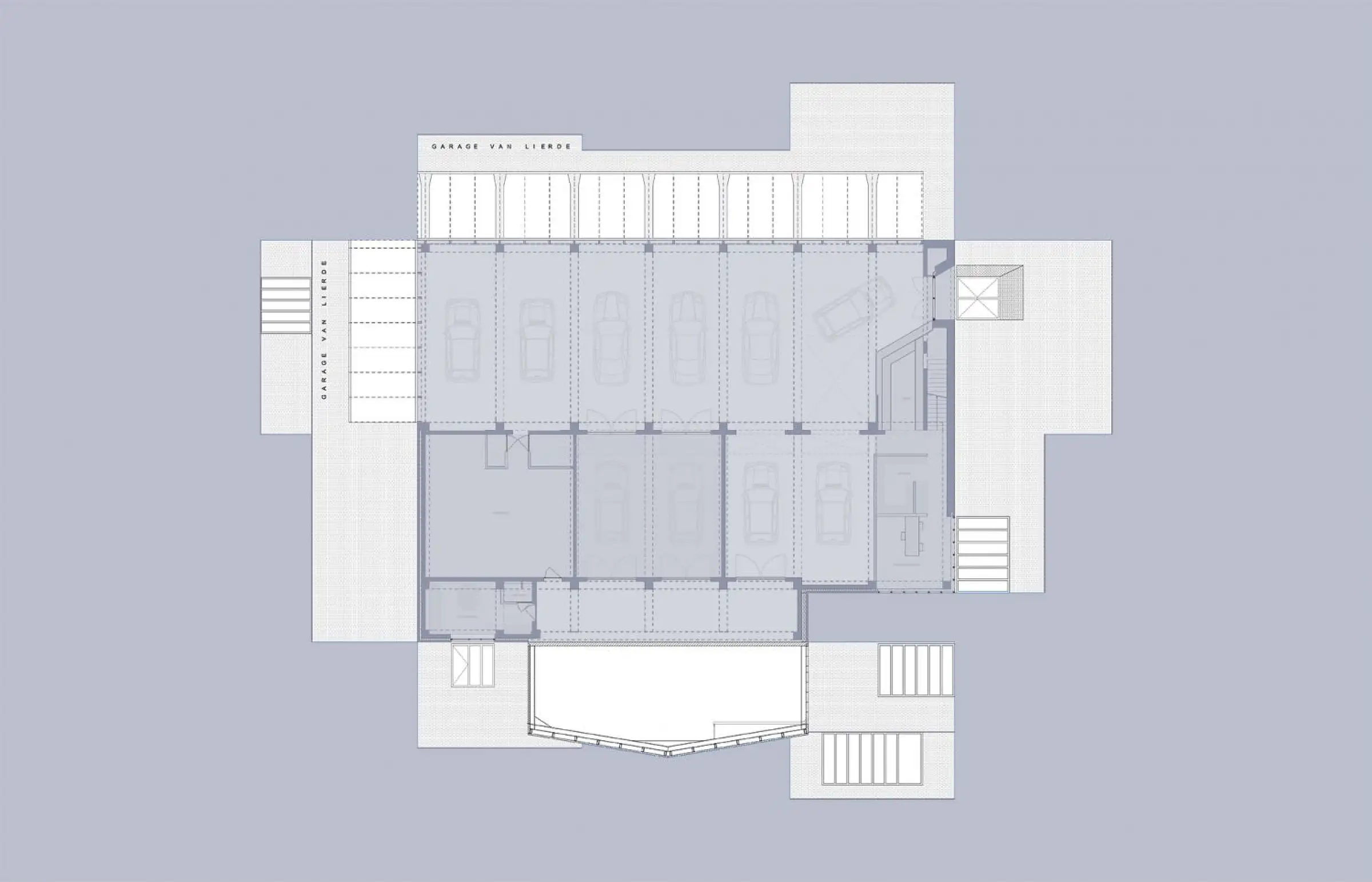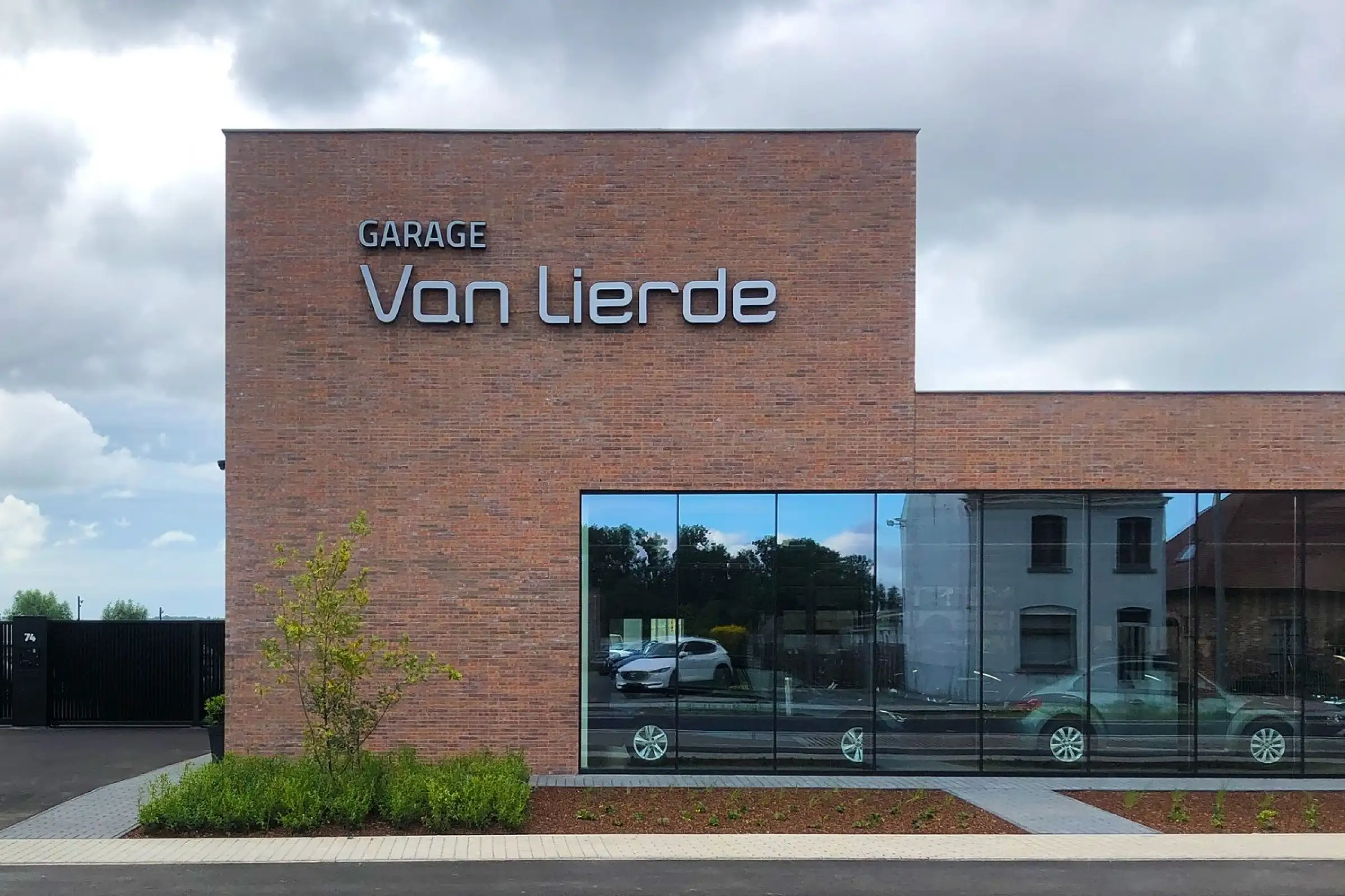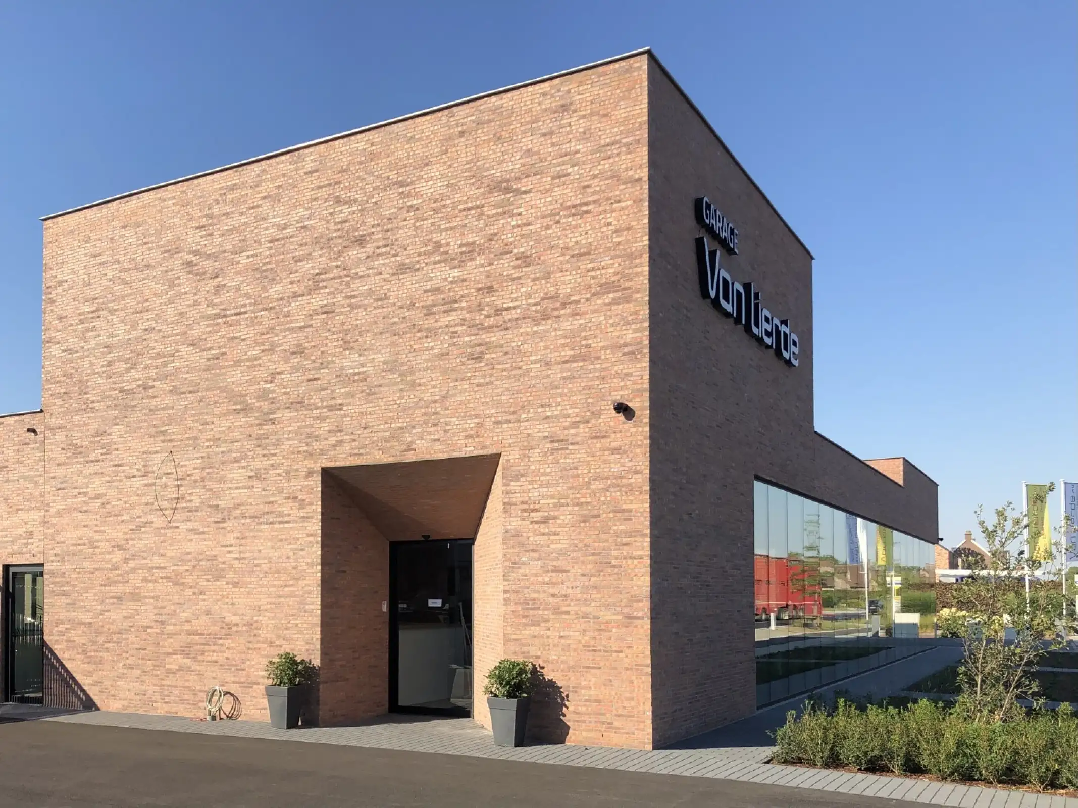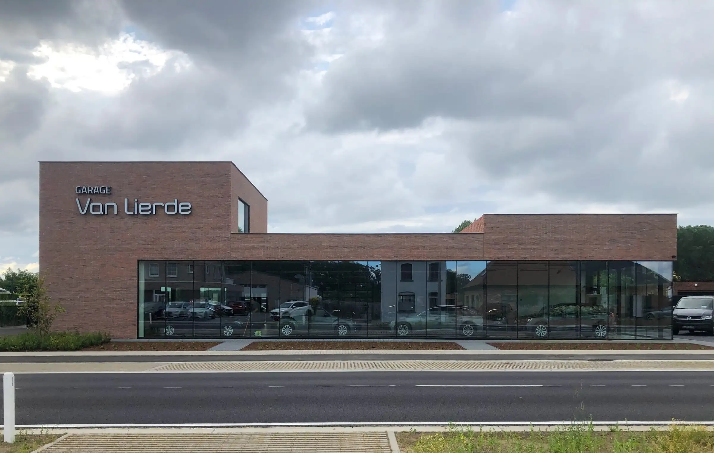 Toonzalen van autoverdelers lijken allemaal sterk op elkaar: stalen dozen met veel glas. Op zoek naar garages in het verleden ontdekten we Garage Ford te Zottegem door architect Lippens. De art-deco geïnspireerde garage was een gracieus landmark. Garage Van Lierde ligt langs de steenweg en moet enerzijds aansluiten bij het lint maar wil ook subtiel opvallen. De obligate glazen vitrine etaleert de meest blinkende carrosserieën en weerspiegelt tegelijk ook het lint. De toonzaal in baksteen en glas is een driedimensionaal gesculpteerd volume met een subtiele en sobere knipoog naar garage Ford.