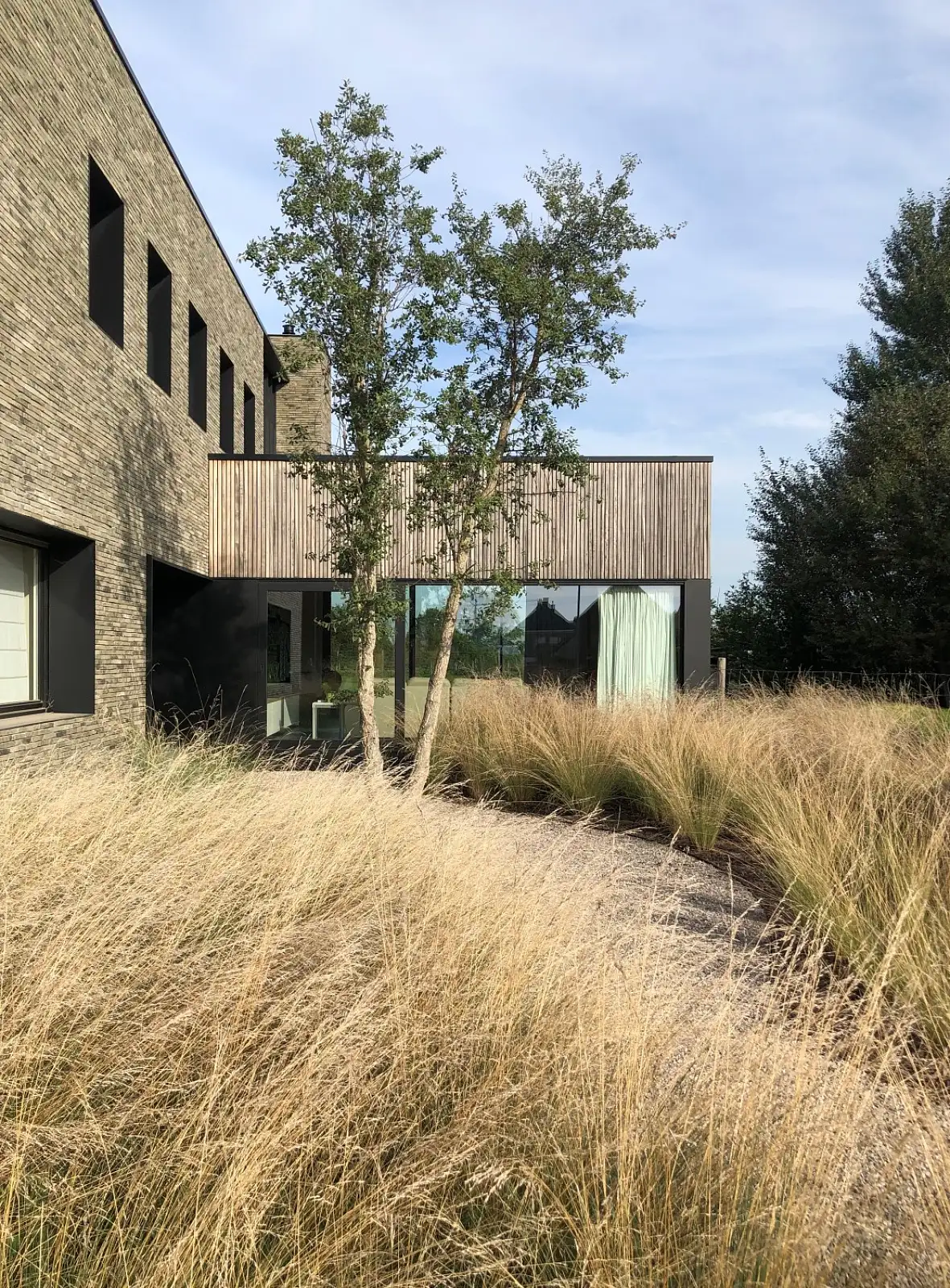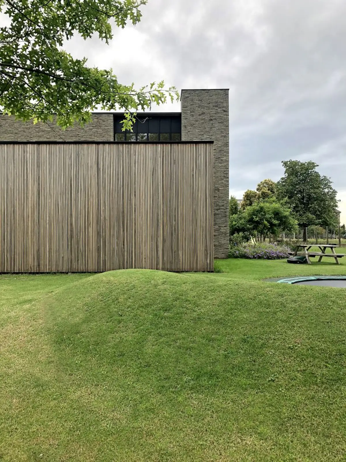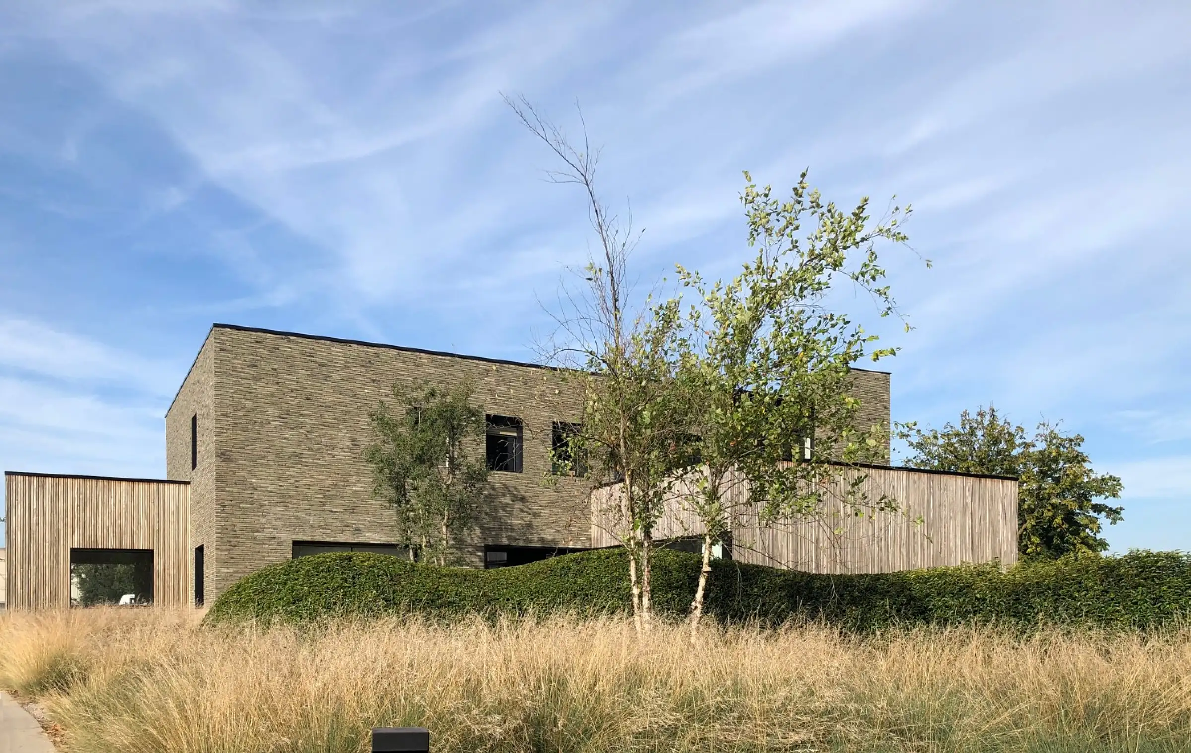 Een bestaande woning en bedrijfsgebouwen van een verdwenen veevoerderbedrijf zijn getransformeerd naar een ééngezinswoning met kantoren voor een tuinbouwbedrijf. De casco van de woning werd voor 75% gerecupereerd. De structurele scheur tussen de oude woning en de voormalige garage werd gebruikt om het volume van de garage te verwijderen en te vervangen door een houten CLT die de nieuwe woonruimte vormt. De vroegere leefruimte werd omgevormd tot kantoor.