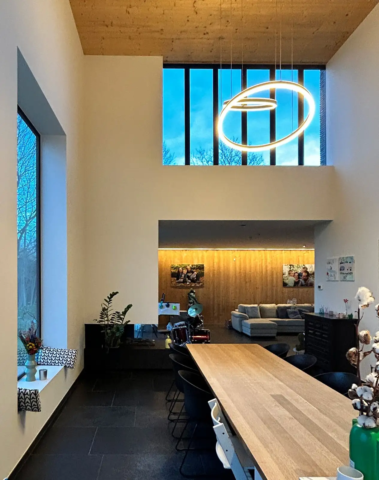 De eetkamer met vide is de spilruimte waarrond alle andere kamers zijn georganiseerd. De nieuwe woonruimte ligt op de noordzijde maar sluit aan bij het zicht op het landschap aan het einde van een bouwlint. Het hoge raam van de eetkamer boven de vide vangt het zuidlicht op de voorgevel en geeft zicht op het groen aan de straatzijde.