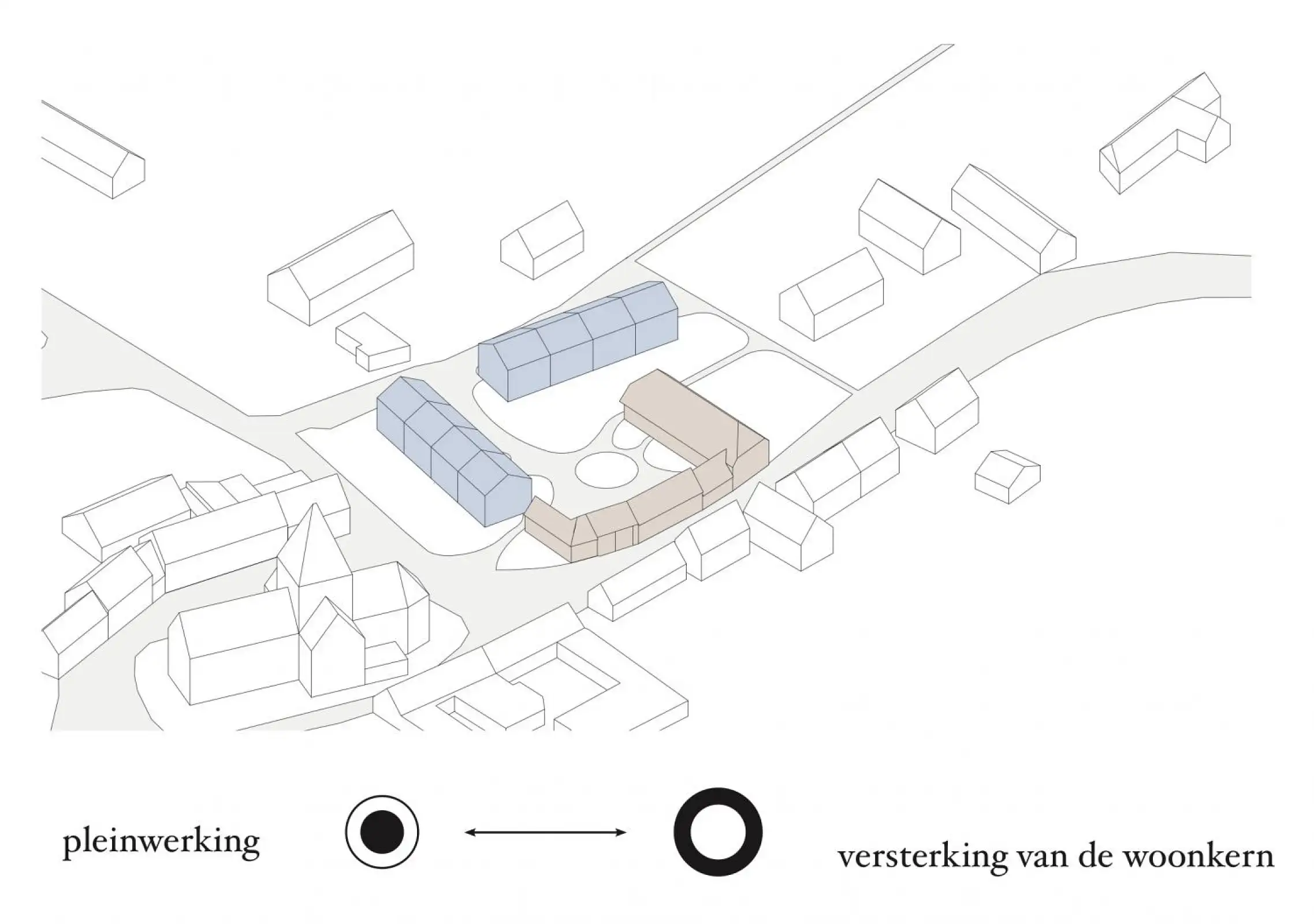 Ter vervanging van de woning worden twee nieuwbouwentiteiten met telkens vier woningen voorzien. Deze zijn licht schuin ingeplant om een mooi afgebakend en rustig binnenplein te krijgen met een logische dynamiek, zijnde een extrapolatie van de amorfe bestaande schuren. Langsheen het terrein lopen twee voetwegen waarvan één is verdwenen en wordt hersteld. Diagonaal verbindt een nieuw olifantenpad de bestaande voetwegen op de ene hoek met het dorpsplein en een nieuwe groene publieke ruimte op de andere hoek. Dit hoekperceel vormt ook de poort en trage ontsluiting van het achterliggende woonuitbreidingsgebied.